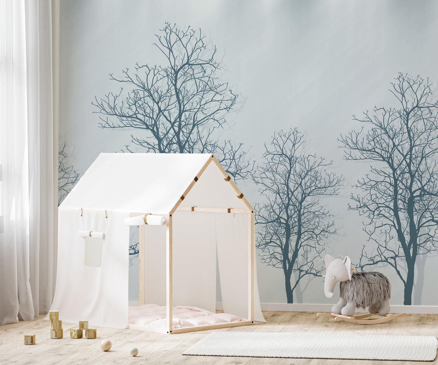 Step into a space that captures a unique blend of mystery and elegance with a living room wallpaper that enchants the onlooker. A captivating Red Sun wallpaper mural, set behind the intricate contours of trees, provides a striking visual contrast that's both dramatic and inviting. The bare, twisted branches of the trees create a stark network against the backdrop, drawing the eye and stirring the imagination. With its leafless tree forms, this mural introduces a subtle touch of intrigue into your home. It invites you to unwind, lower the lights, and immerse yourself in an otherworldly forest scene. As dusk falls, the red sun's fiery orb emits a soft, ethereal glow against the complex branches, keeping the darkness at bay. Give in to the seductive charm of this mystical landscape and let your thoughts drift amongst the silent whispers of the enchanted woods.