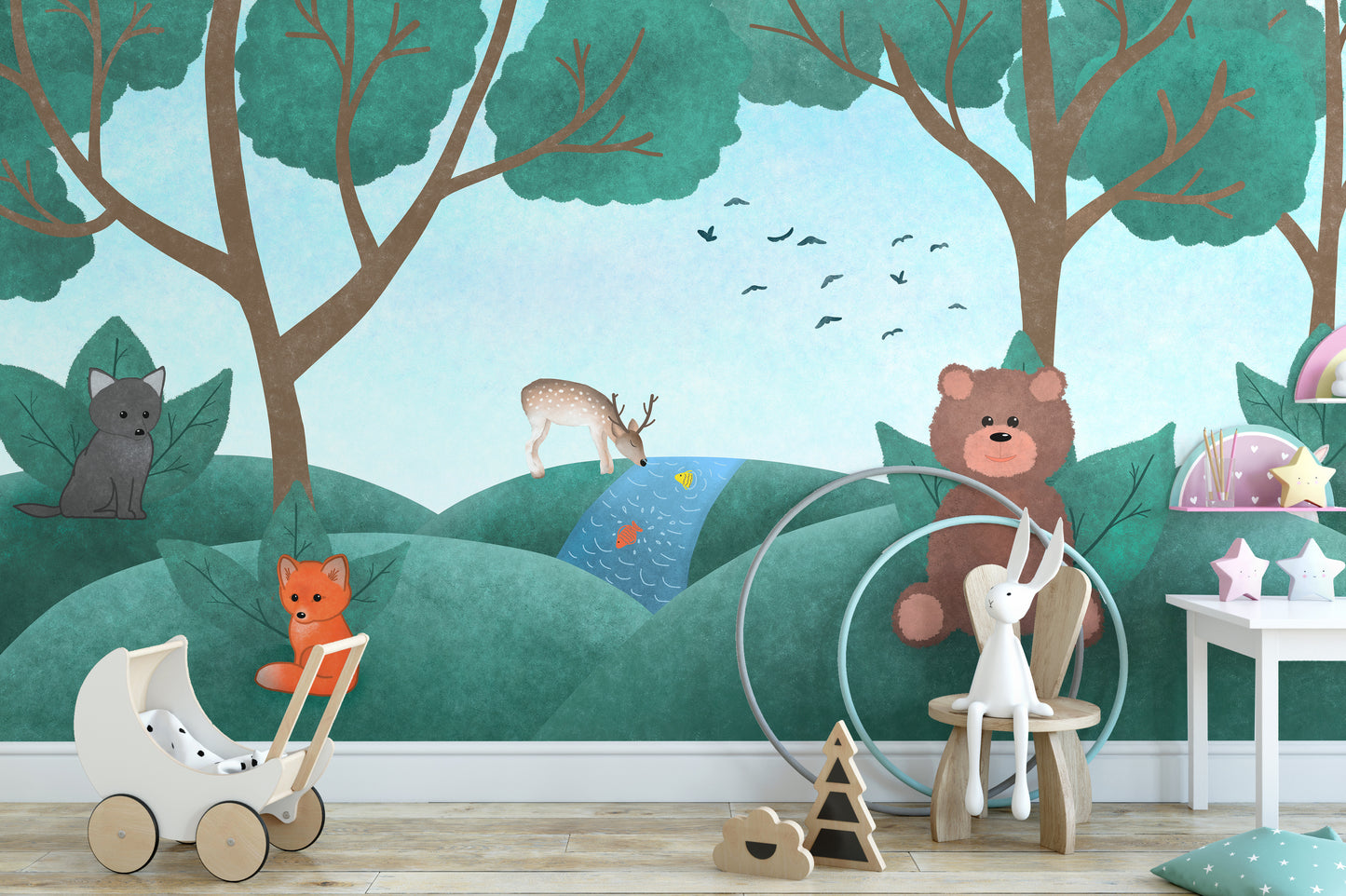 Immerse your child's room in the enchantment of nature with our Fairy Forest Animal Wallpaper. Expertly crafted with watercolor illustrations, this self-adhesive wallpaper showcases a myriad of woodland creatures that inspire tales of fantasy and adventure. Perfect for young explorers and dreamers alike, the wallpaper's grunge fairy forest design infuses a rustic charm, adding a sprinkle of whimsy to your kid's sanctuary.
