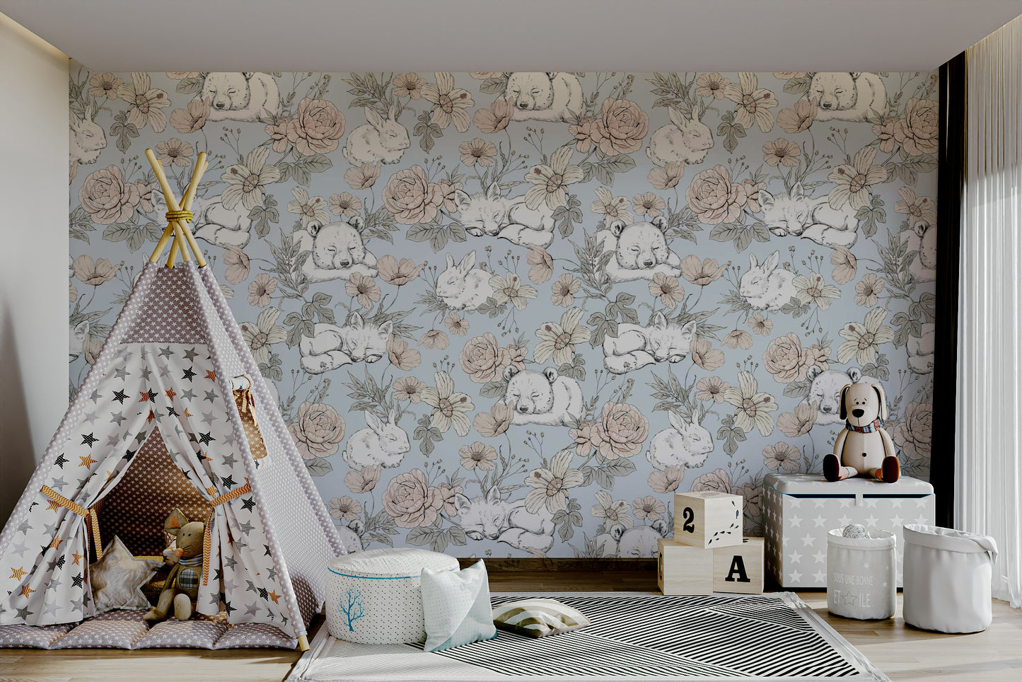 Bring serene woodland vibes to your little one’s space with our Sleeping Woodland Blue nursery wallpaper. Featuring gentle hand-drawn animals nestled among soft blush florals on a calming pastel blue background, this design evokes comfort, calm, and storybook charm. Ideal for kids rooms, nurseries, and baby spaces, this wallpaper blends elegance with a playful nature. The peel-and-stick material ensures easy application and renter-friendly removal. Whether you're a parent styling a peaceful nursery or a designer curating a whimsical children's room, this wallpaper creates the perfect dreamy retreat.