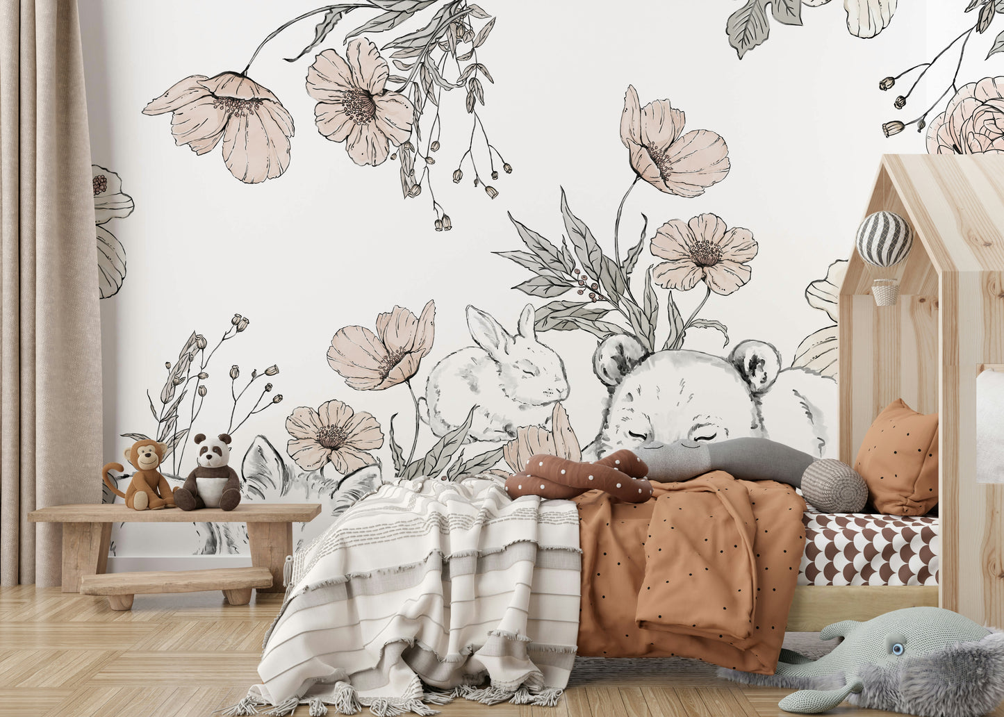 Drift into a world of peace and whimsy with the Sleeping Woodland Mural Wallpaper by designer Ewa Brzozowska for Giffywalls. This enchanting mural showcases a fox, bunny, and bear peacefully asleep among delicate hand-drawn florals and leaves, brought to life in a soothing neutral palette. Ewa’s signature soft, storybook style makes this mural ideal for nurseries, playrooms, or any space in need of a calming touch. Thoughtfully illustrated and rich in charm, it invites serenity while sparking the imagination. Let this mural wrap your walls in the gentle hush of the forest, where every nap feels like a fairy tale.