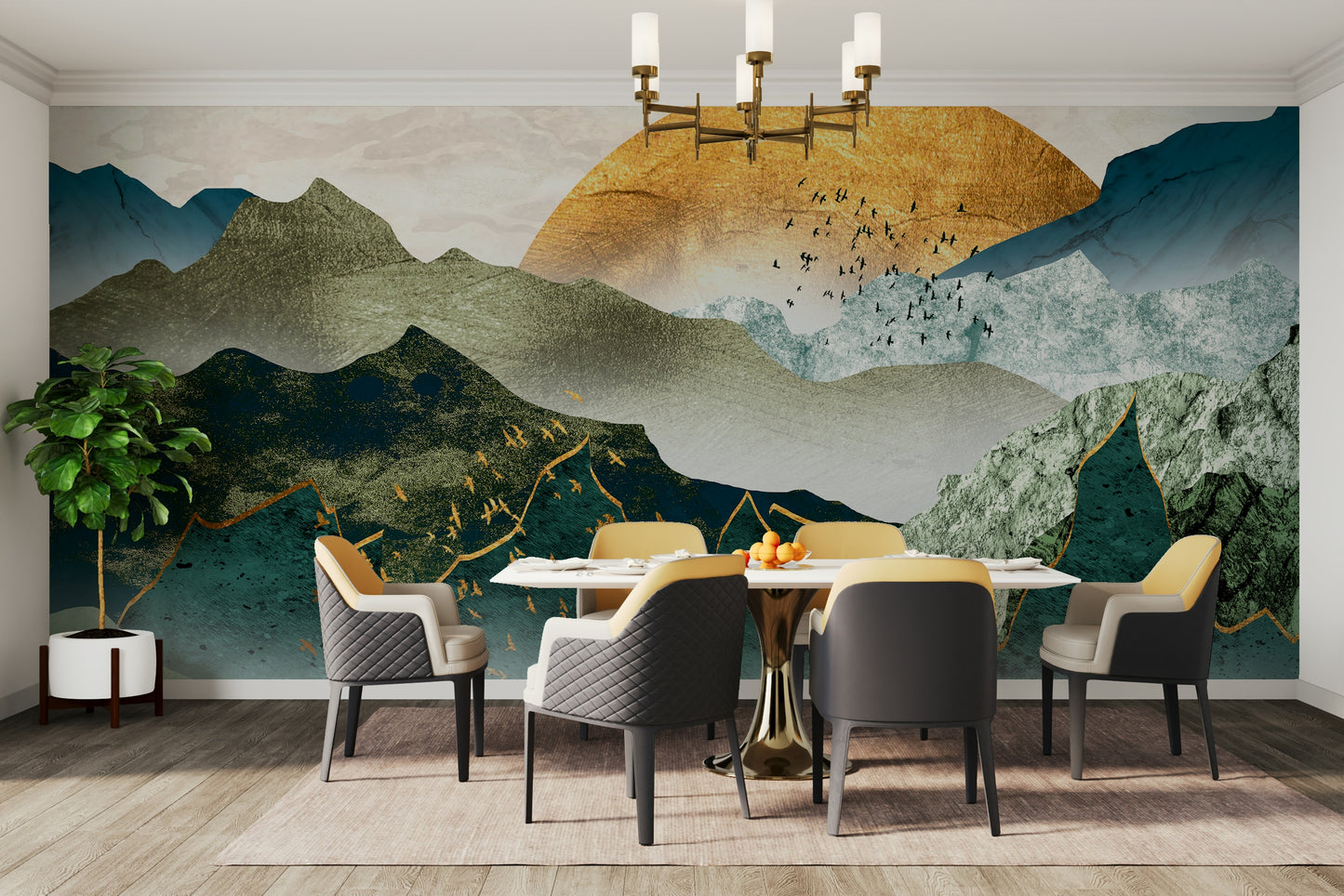 Green Golden Mountains Sunset Wallpaper – Peel and Stick Wallpaper