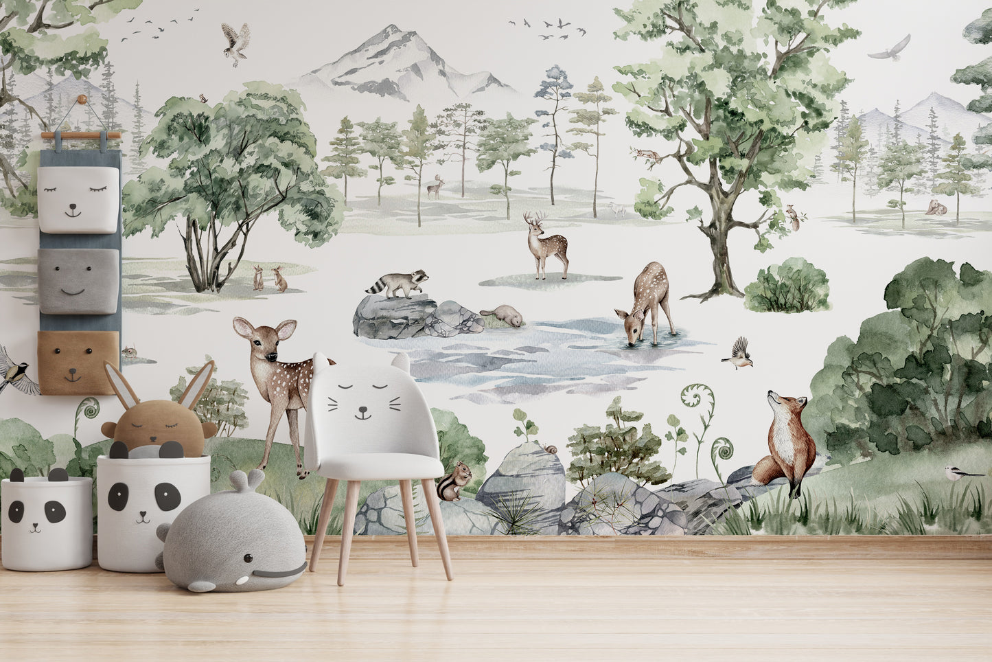 Bring the quiet majesty of winter indoors with the Watercolor Deer Winter Forest Animals Wallpaper. This stunning mural captures a peaceful winter scene, featuring deer and forest animals amidst a snowy landscape, all beautifully rendered in watercolors. The cool tones and delicate details evoke the silent beauty of the forest in winter, creating a tranquil and soothing ambiance in any room. Perfect for those who wish to add a touch of winter's grace to their decor, this winter forest animal wallpaper offers an elegant and serene backdrop. Let the peacefulness of a winter forest envelop your space, creating a cozy retreat from the world outside.
