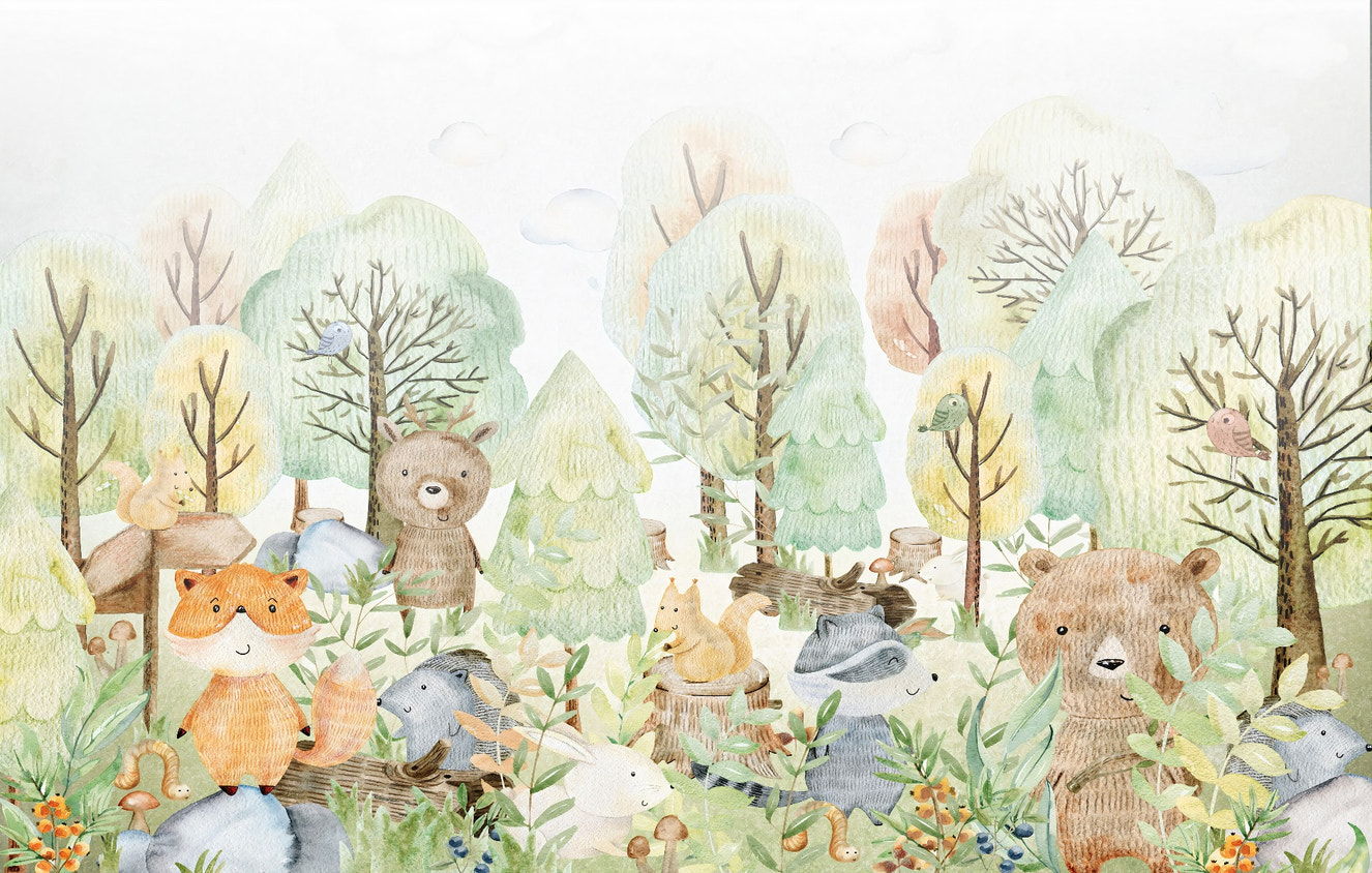 Discover our nursery wallpaper featuring cartoon-style rabbits, foxes, pandas, and squirrels, adding cuteness to the extreme. It refreshes the little ones and sparks curiosity about the four-legged furry friends.