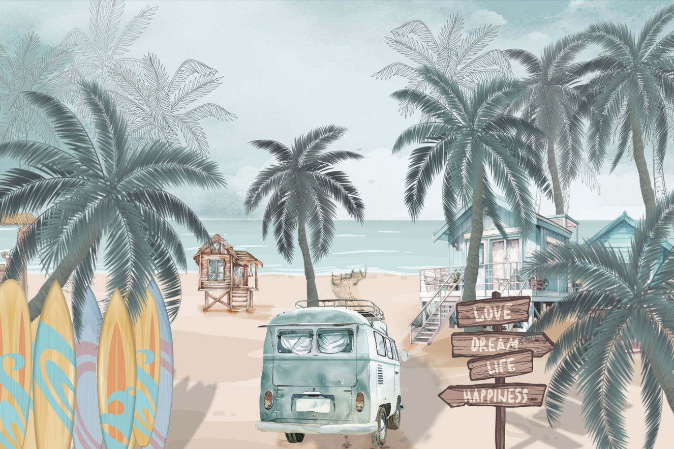 Tropical beach mural wallpaper has bright colors, lots of green plants, and scenes of exotic beaches. With our beach theme, you can bring the warmth and life of the tropics into your own house. It will feel like you're getting away all the time.