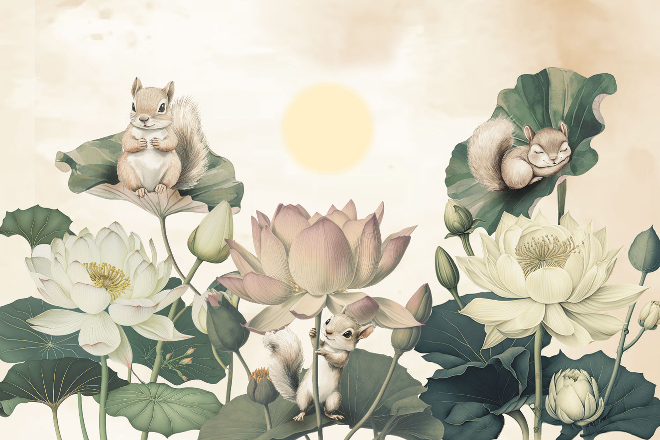 Whimsical Lotus Garden Squirrel Mural