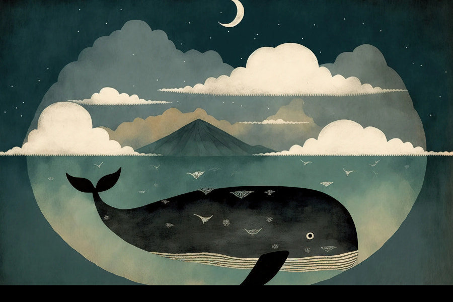 Enhance your space with our fantasy and dreamy creations, where whales are not confined to the ocean; they fly into the realm of fantasy. Rise to the sky and pass through floating sky castles with this mural of mysterious whales for a seamless experience—all swirling together in a dream-book-like wonderland. A celestial safari whale sky mural featuring a herd of ethereal whales circling a sky filled with dreamy clouds, beckoning the viewer to the sky's wonders. This mural shows huge whales and a beautiful sky that float majestically over the breathtaking urban life scene—through the eyes of magical realism, magical realism that can only be imagined when looking at the picture.