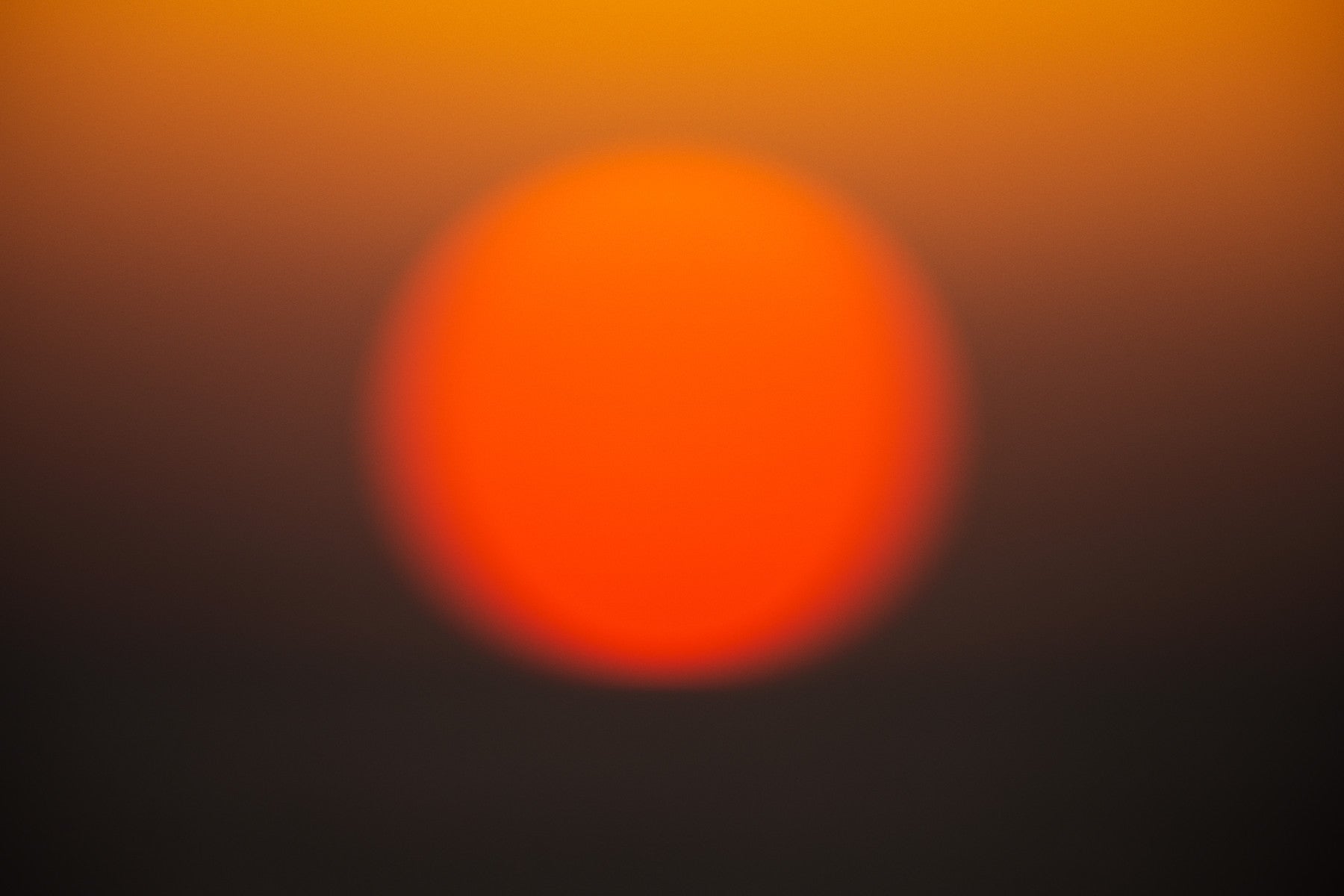 A beautiful abstract photo of a blurred orange sun setting over a dark horizon.