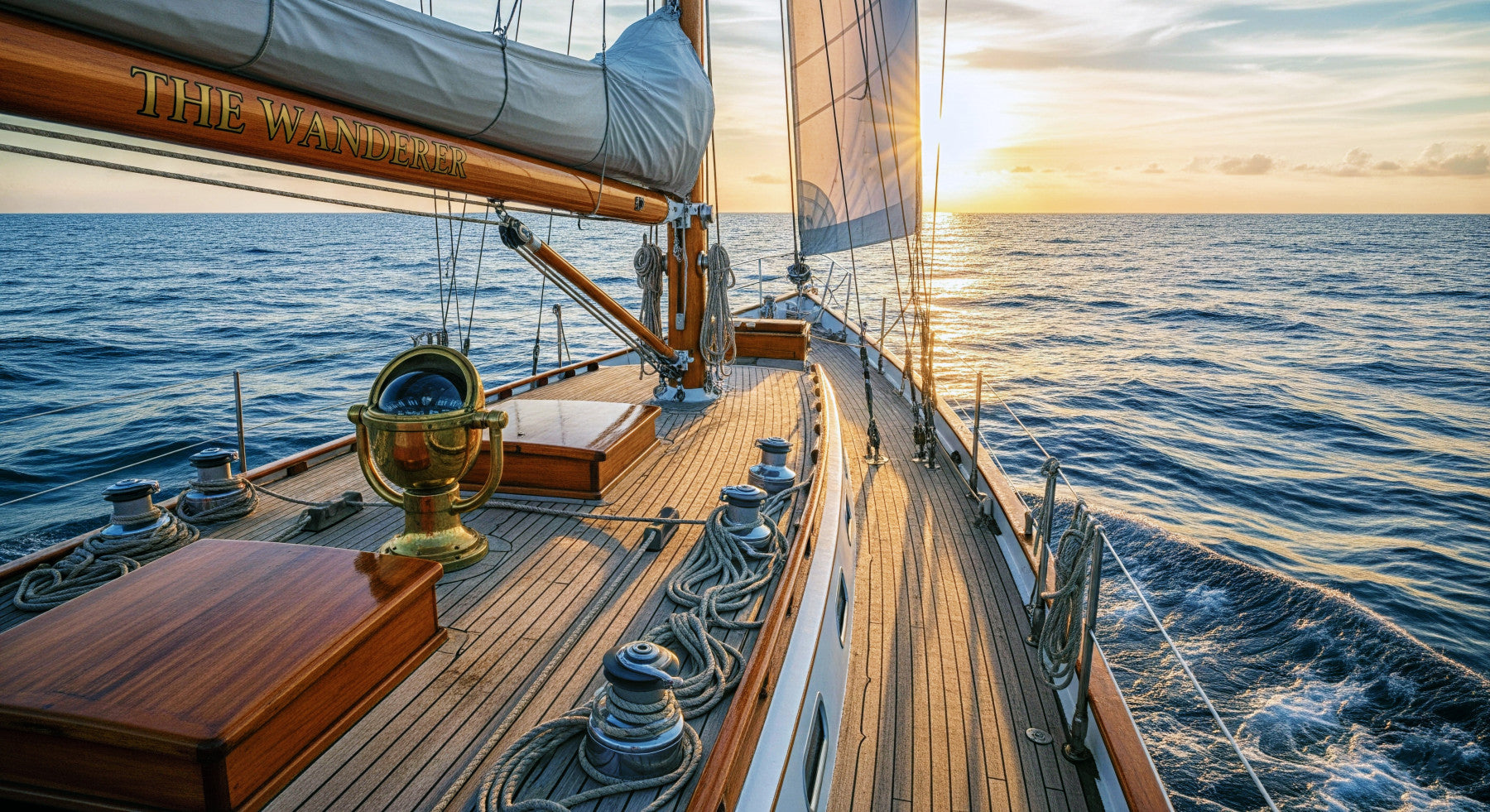 Imagine the endless horizon with this captivating wallpaper for walls. The deck of a sailboat is the focal point, leading your eye to the meeting of sea and sky at sunset. The craftsmanship of the wooden deck, combined with the gleaming brass details, creates a feeling of luxury and adventure. Use this design to infuse your bedroom, living room or even a hallway with a serene, nautical vibe that enhances the interior space with a blend of comfort and maritime charm.