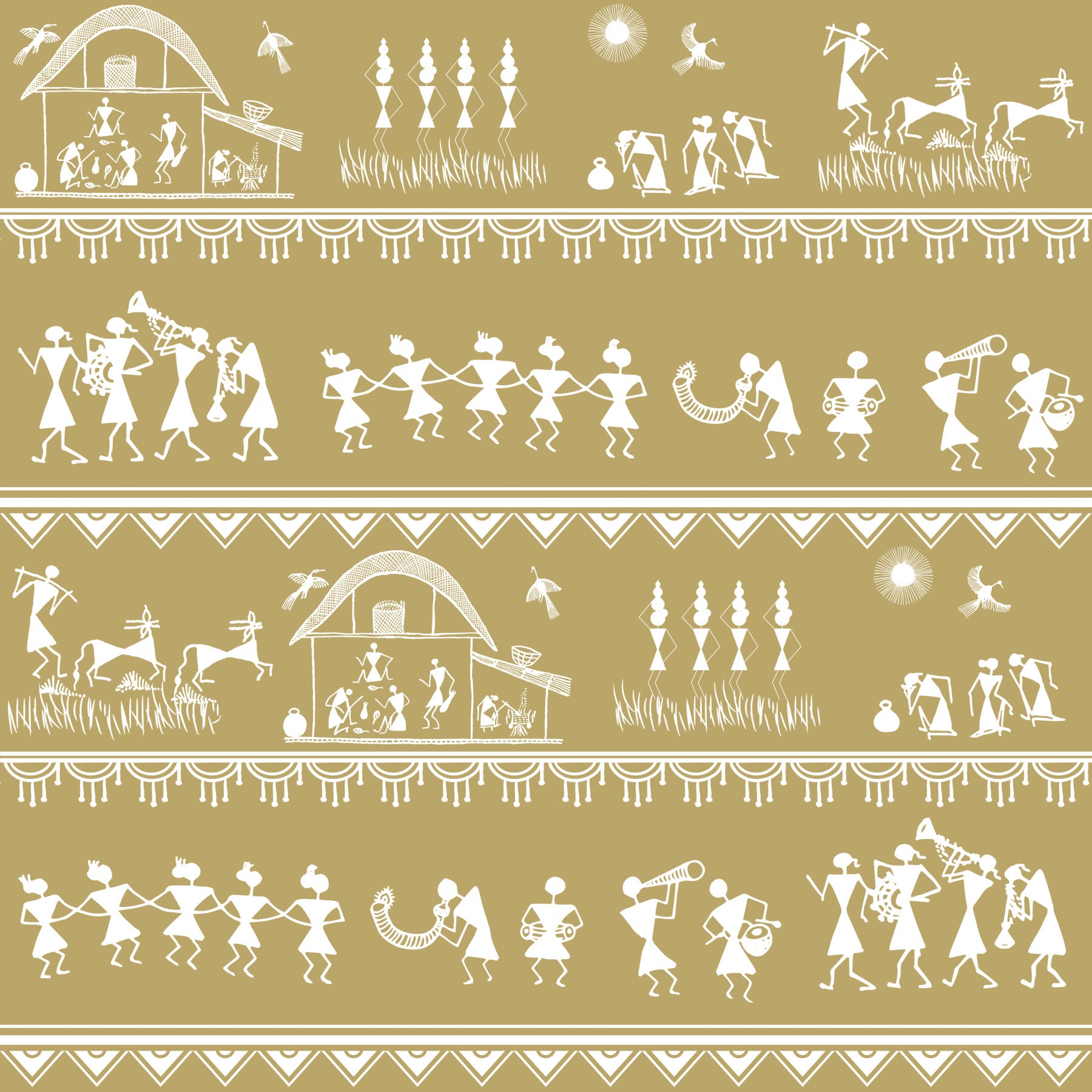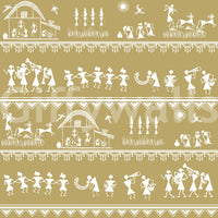 Transport your walls to the heart of tribal life with 'Adivasi Chronicles,' a mesmerizing design inspired by the ancient art of the Warli tribe. This wall covering portrays the vibrant tapestry of daily existence, echoing the rhythmic pulse of the indigenous community. Witness scenes of shared labor, festive celebrations with musical instruments and dancers, and the symbiotic relationship between humans and nature. The rustic beige backdrop accentuates the intricate white motifs, creating a timeless aesthetic that complements both modern and traditional spaces. This piece tells a silent story of resilience, harmony, and the enduring spirit of Adivasi culture, adding a touch of ethnic elegance and cultural depth to your interior décor. Each motif is thoughtfully placed, breathing life into your walls and fostering an atmosphere of cultural appreciation.