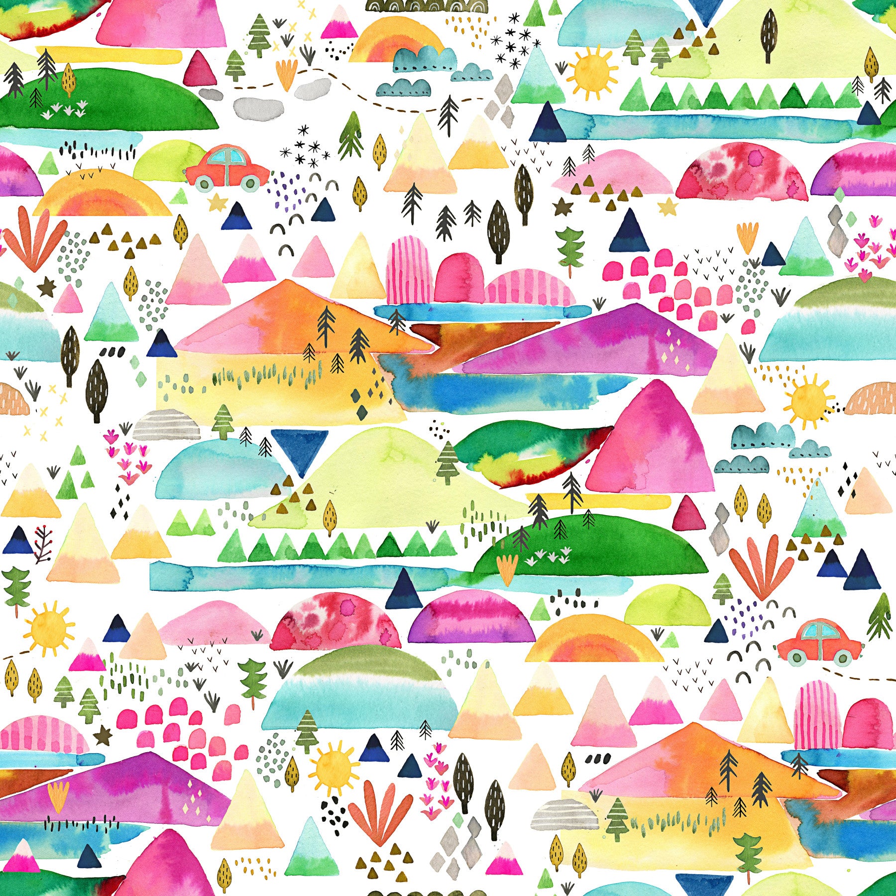 Cartoon mountains and trails on kids’ wallpaper