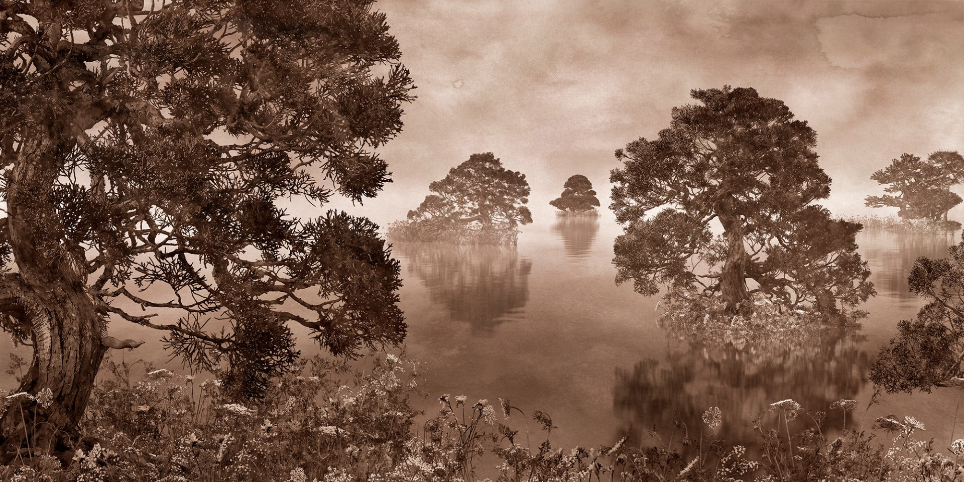 Add sophistication with watercolor lake sepia ink monochrome wallpaper.