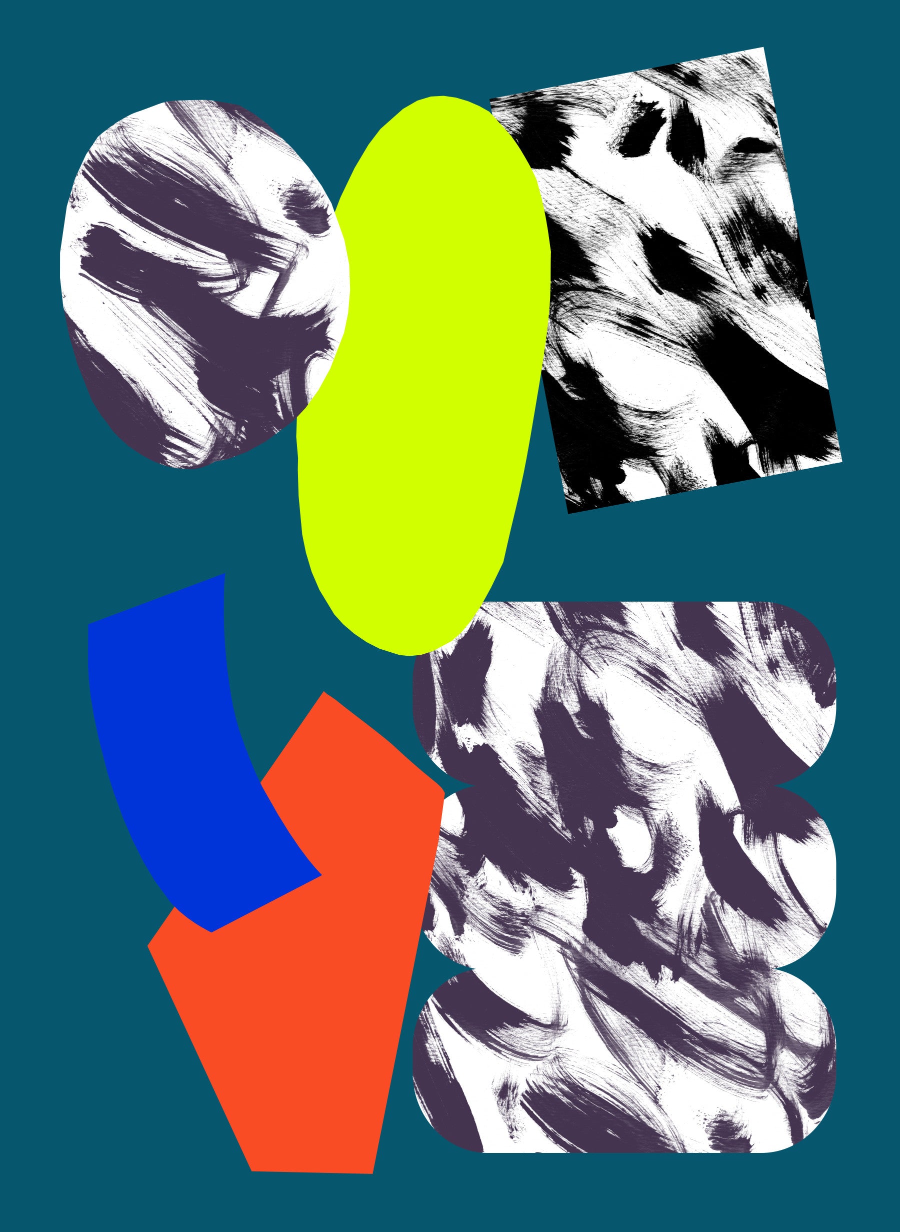 Bold abstract blocks and curved forms layered across a rich teal wallpaper backdrop.