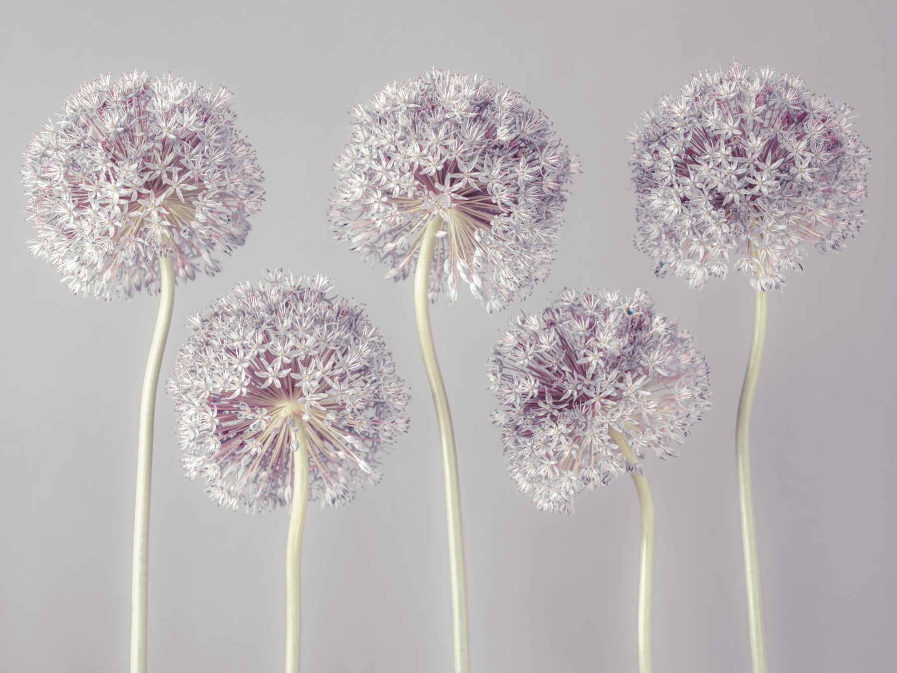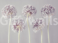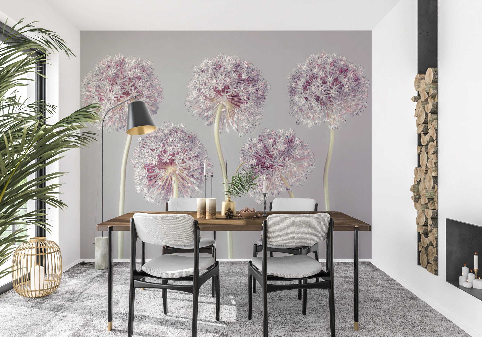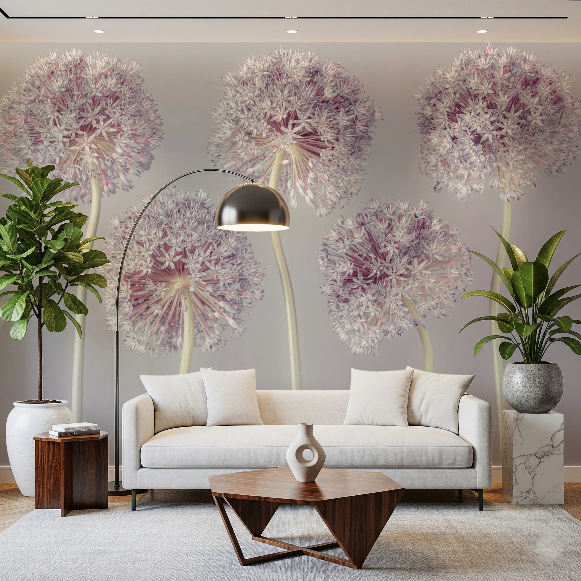Alliumblomster. Giv væggene den blide charme af blomstrende alliumblomster. Dette vægtapet bringer et strejf af fredfyldt landskab indendørs og fremviser sarte, sfæriske blomster i en blød, afdæmpet farvepalet. De yndefulde stilke skaber en følelse af vertikalitet, hvilket gør det ideelt til gange, soveværelser eller stuer. Den overordnede effekt er beroligende og sofistikeret og tilføjer et subtilt lag af visuel interesse uden at overvælde rummet. Dette design fungerer særligt godt i rum med naturligt lys og fremhæver den luftige og fredelige atmosfære. Det komplementerer både minimalistiske og klassiske indretningsstile.
