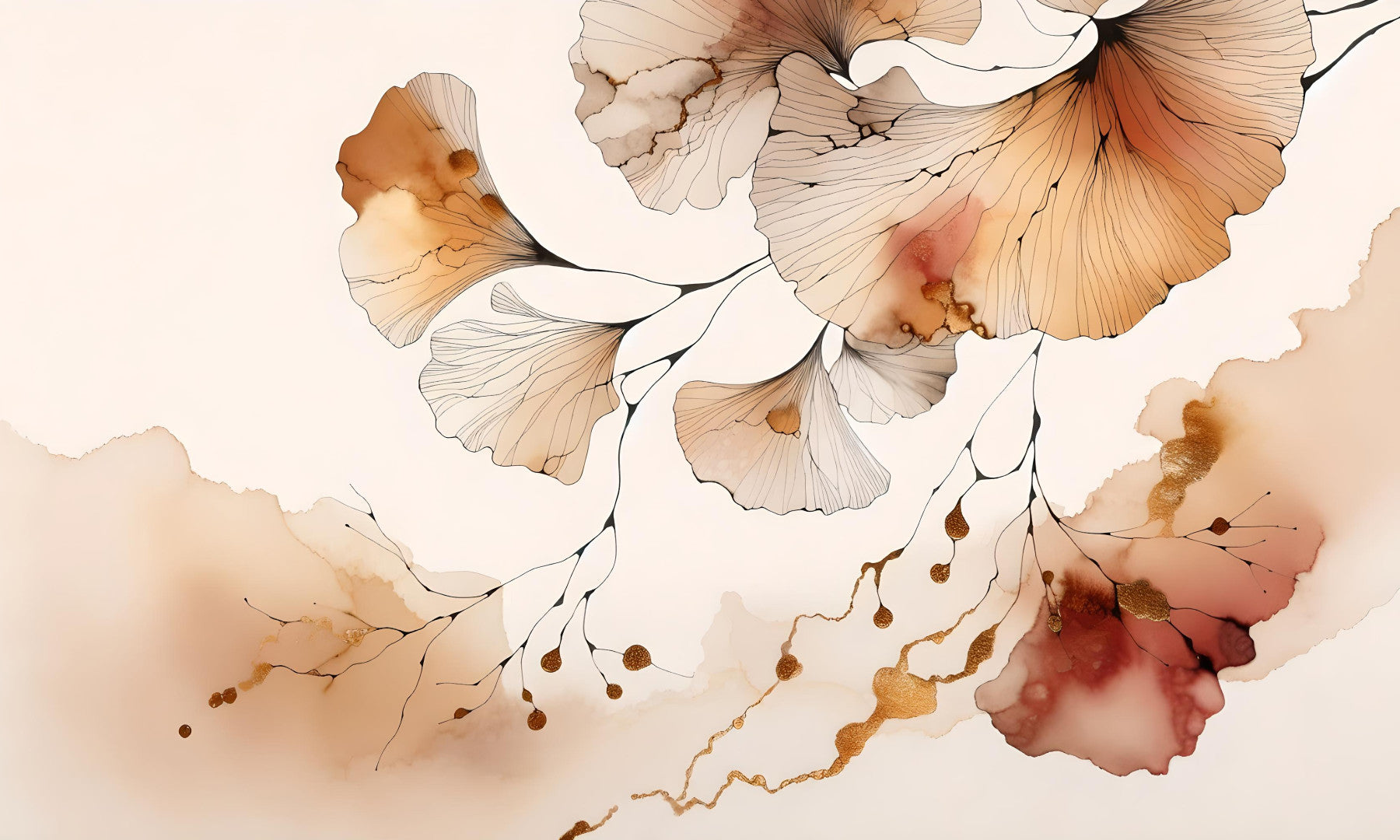 Dette æteriske tapet viser en delikat akvarel- og blækkunst med stiliserede Ginkgo Biloba -blade. Bladene gengives i bløde beige og brune nuancer, deres komplicerede vene strukturer fremhævet af fine sorte streger. Elegante guld accenter flyder gennem sammensætningen og tilføjer et strejf af luksuriøse gnist. Den samlede effekt er rolig og beroligende, hvilket skaber en sofistikeret atmosfære perfekt til en stue, soveværelse eller hjemmekontor. Den subtile farvepalet og flydende linjer fremmer en følelse af ro og fredelig kontemplation, hvilket gør dette tapet til en smuk tilføjelse til ethvert rum.