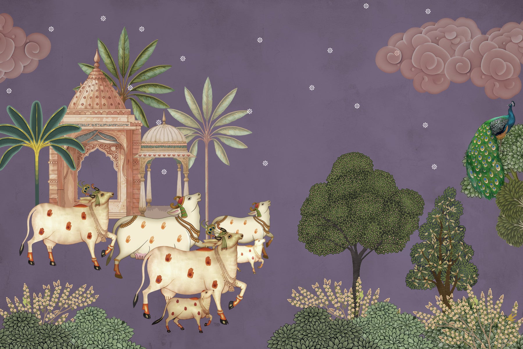 Immerse yourself in the divine serenity of 'Amrit Dhara', a captivating wallpaper that evokes a sense of purity and auspiciousness. This artwork features a traditional Indian miniature style with a soothing color palette. The central theme revolves around a procession of sacred cows, gracefully adorned, wandering through a landscape dotted with intricately designed pavilions and lush palm trees. A majestic peacock perched atop a tree adds a touch of vibrant color and regal charm, enhancing the overall aura of tranquility. The soft, cloud-like forms in the background contribute to the dreamlike quality of the scene. 'Amrit Dhara' serves as a visual gateway to a realm of peace and spiritual harmony, making it a perfect addition to any space seeking a touch of cultural richness and mindful aesthetics.