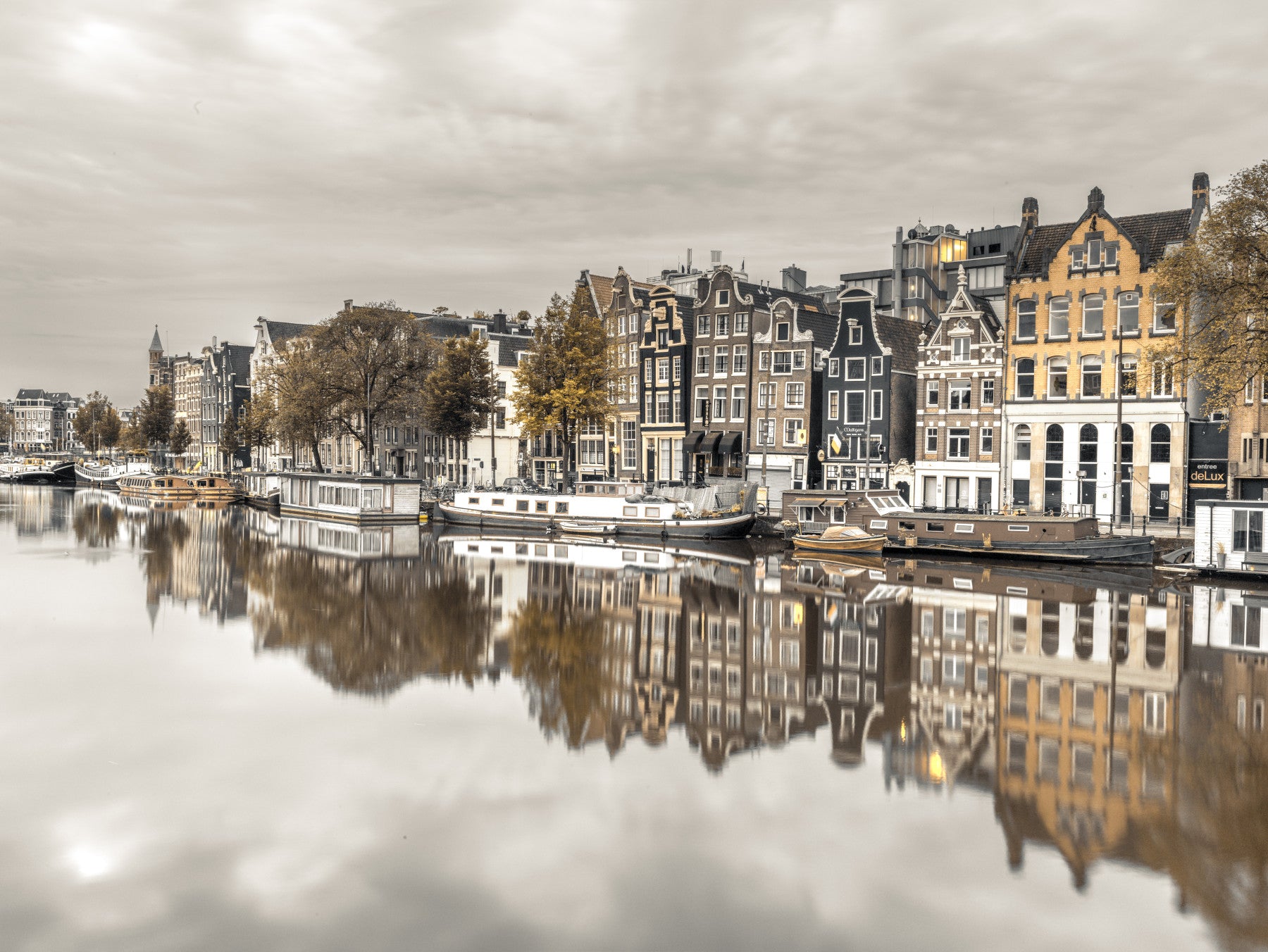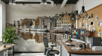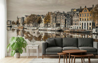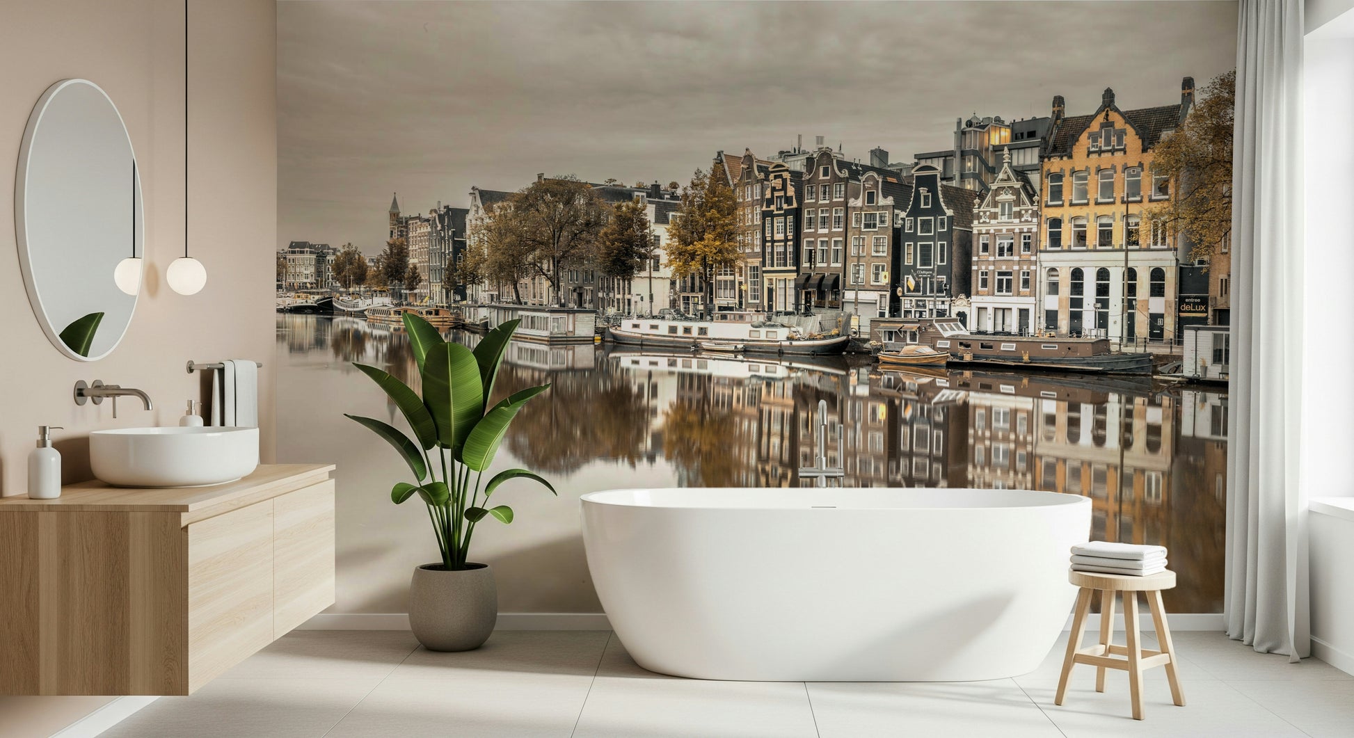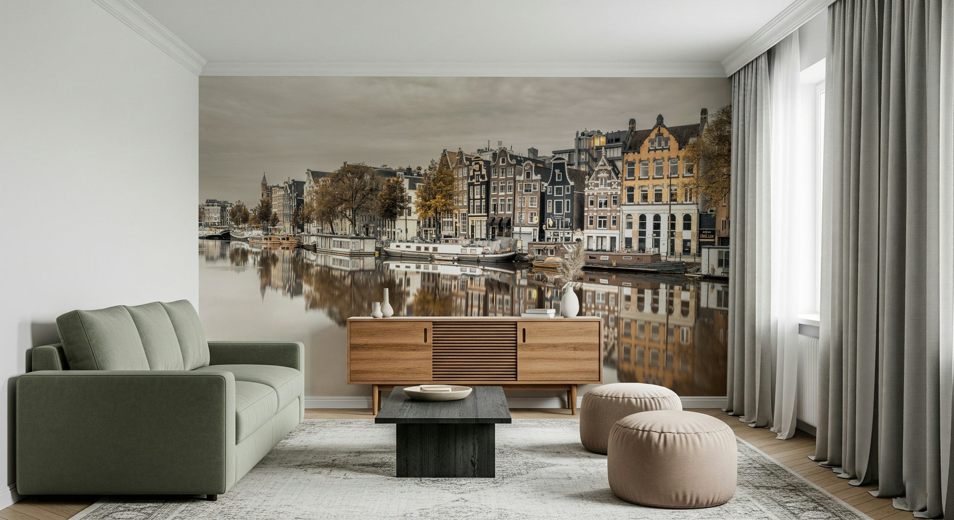 Capture the tranquil beauty of Amsterdam with this wallpaper for walls. Observe the captivating reflections of the canal houses shimmer on the calm water, creating a serene atmosphere. The muted gold and brown hues evoke a sense of warmth and nostalgia. Install this wallpaper in a living room or office to enhance the interior design with a touch of European sophistication. Let the design transport you to the heart of the Netherlands.