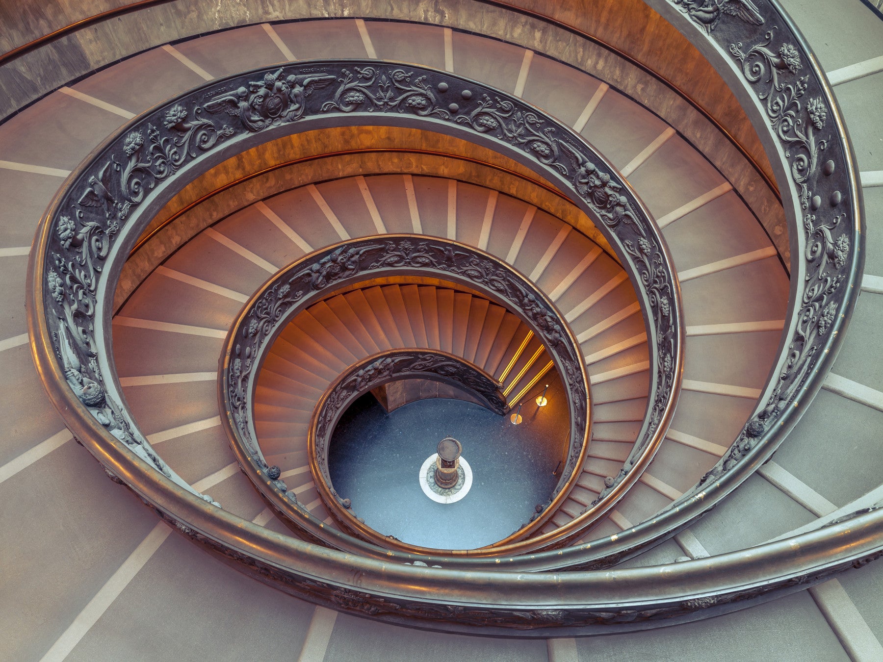 Oplev storslået af arkitektonisk design med dette tapet med en fængslende spiraltrappe. Billedets overheadperspektiv afslører den komplicerede skønhed i trappens bronze rækværk, pyntet med fint udformede keruber og hvirvlende blomstermønstre. Den varme belysning forbedrer strukturen og farven på stentrinnene og skaber en sofistikeret og indbydende atmosfære. Dette visuelt fantastiske tapet udstråler tidløs elegance, perfekt blandet klassisk og moderne æstetik. De rige toner af beige og brun skaber en følelse af ro og ro, hvilket gør det ideelt til at øge stemningen i forskellige boligarealer. Dens komplicerede detaljer og storslåede skala vil omdanne enhver væg til et samlingspunkt for raffineret smag og sofistikeret design.