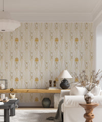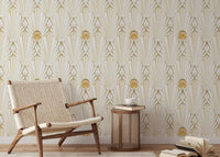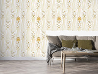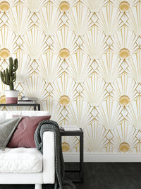 Forkæl dig med den overdådige charme ved denne art deco-inspirerede tapet. Guldgeometriske linjer udstråler udad fra et centralt solburst -motiv, hvilket skaber et fængslende samspil af lys og skygge mod et cremet hvidt baggrund. Subtile strukturerede detaljer forbedrer den luksuriøse fornemmelse, hvilket gør det perfekt til at tilføje et strejf af vintage glamour til ethvert rum. Det sømløse mønster sikrer et sammenhængende og sofistikeret look, der er egnet til stuer, soveværelser eller endda en erklæringsfunktion på et kontor. Dette tapeters raffinerede æstetik er både tidløs og trending, hvilket øjeblikkeligt løfter din indretning med dets yndefulde design og rige guld accenter.
