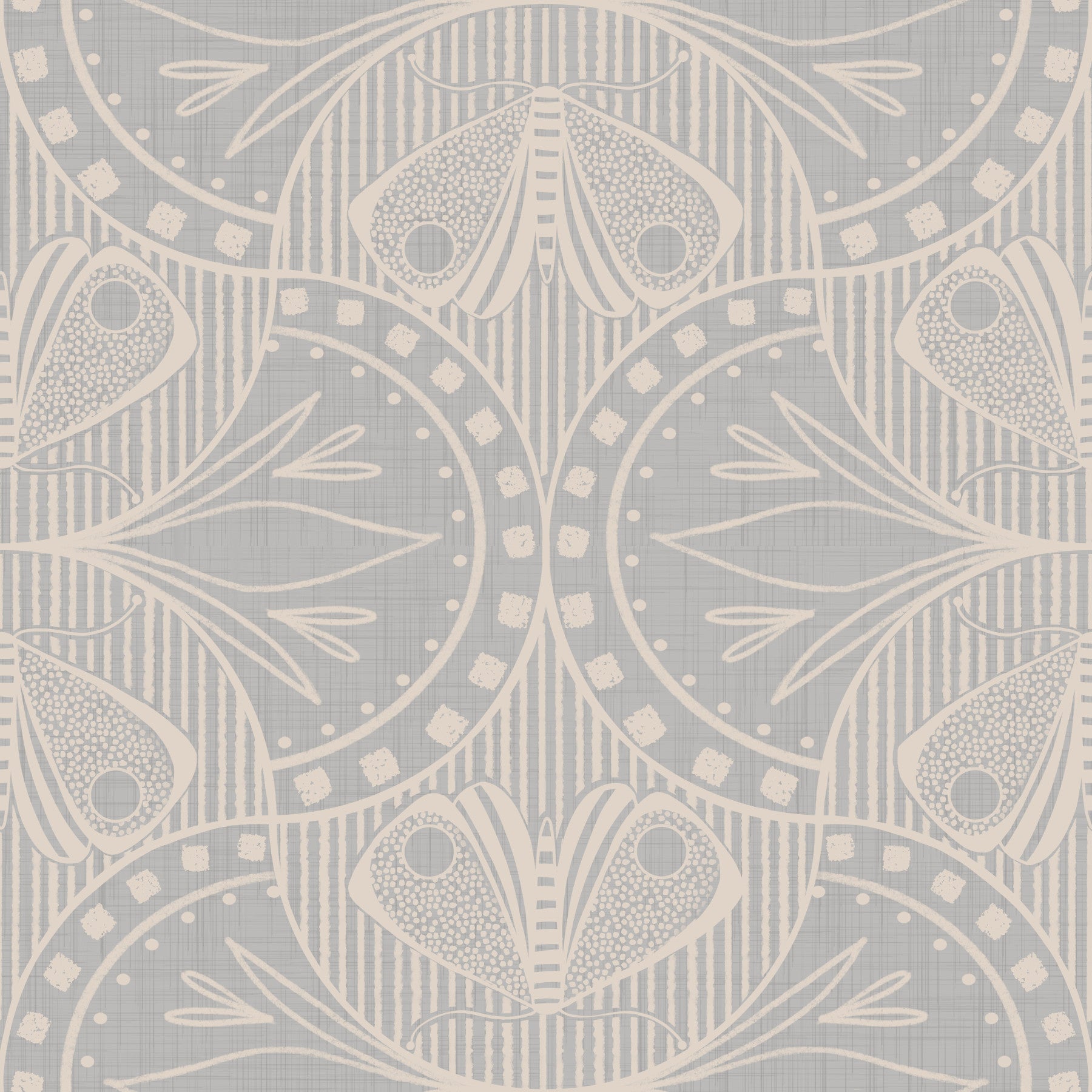 Subtle grey wall mural with elegant pale moth figures, intricate detailing.