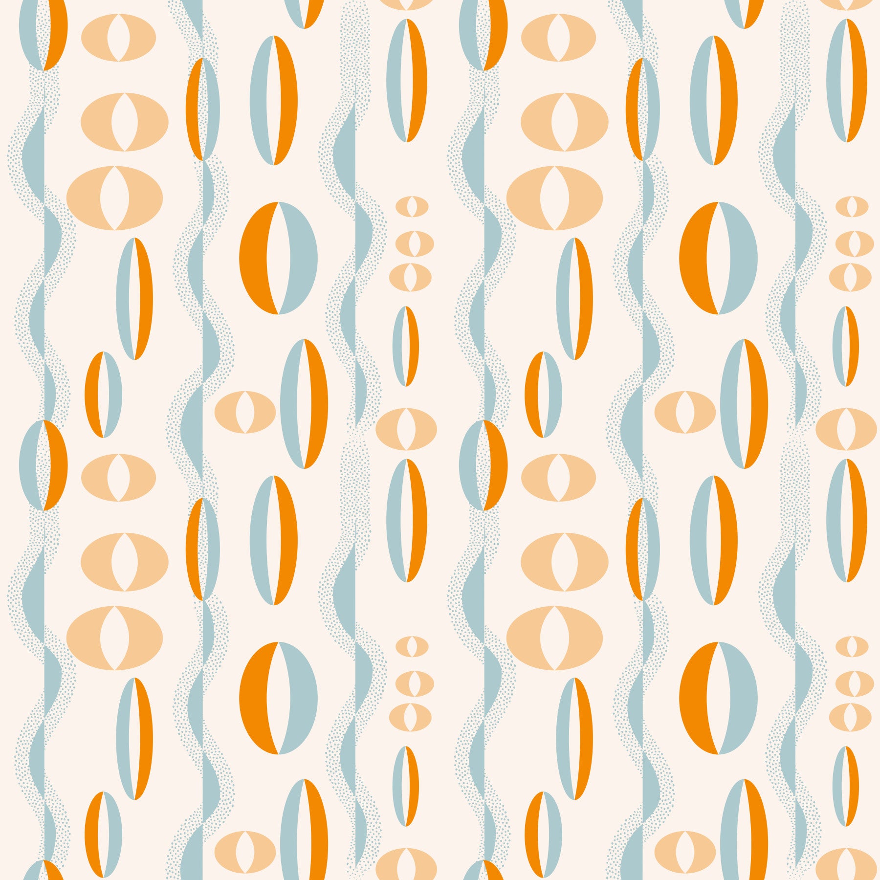 A warm-toned atomic wallpaper with orange, teal, and beige oval shapes in a rhythmic pattern.