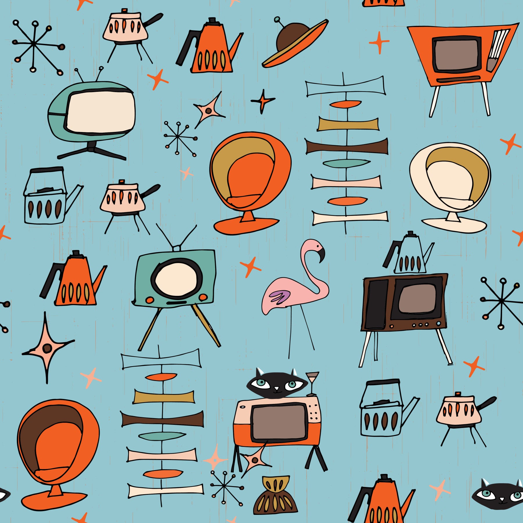 Blast off into a world where mid-century modern meets playful eccentricity with the 'Atomic Retro Living Kitsch Blue' wallpaper. This delightful design is a vibrant homage to the atomic age, splashed across a serene blue backdrop. Quirky illustrations of retro TVs (some even inhabited by mischievous cats!), stylish space-age chairs, futuristic tea kettles, and a touch of flamingo fabulousness dance amongst starbursts and atomic motifs. This wallpaper brings a healthy dose of vintage charm mixed with a bold, kitsch aesthetic. If you're seeking to inject a dose of fun and retro flair into your living space, look no further. Prepare for a nostalgic journey back to the future, with a dash of playful irony!