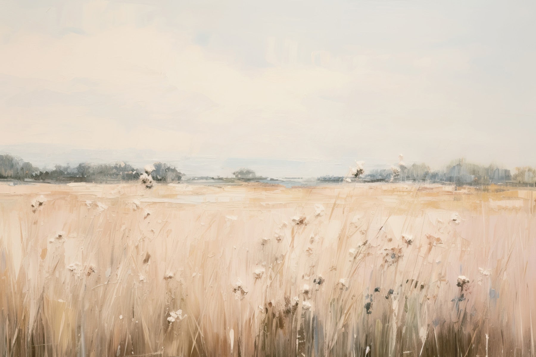 Omfavne den rolige skønhed i august med dette fængslende tapet. Et drømmende landskab udspiller sig, malet i bløde, dæmpede toner af beige og grå. Delikate vilde blomster punkterer et felt med høje græs, der strækker sig mod en uklar horisont, hvor en fjern linje af træer blødt silhuetter mod en lys himmel. De synlige børstestræk tilføjer tekstur og dybde og skaber en rolig og impressionistisk scene, der perfekt fanger den lange stemning i en sensommerdag. Dette kunstværk fremkalder følelser af fred og stille kontemplation, hvilket gør det til det ideelle baggrund for et beroligende digitalt arbejdsområde eller startskærmen.