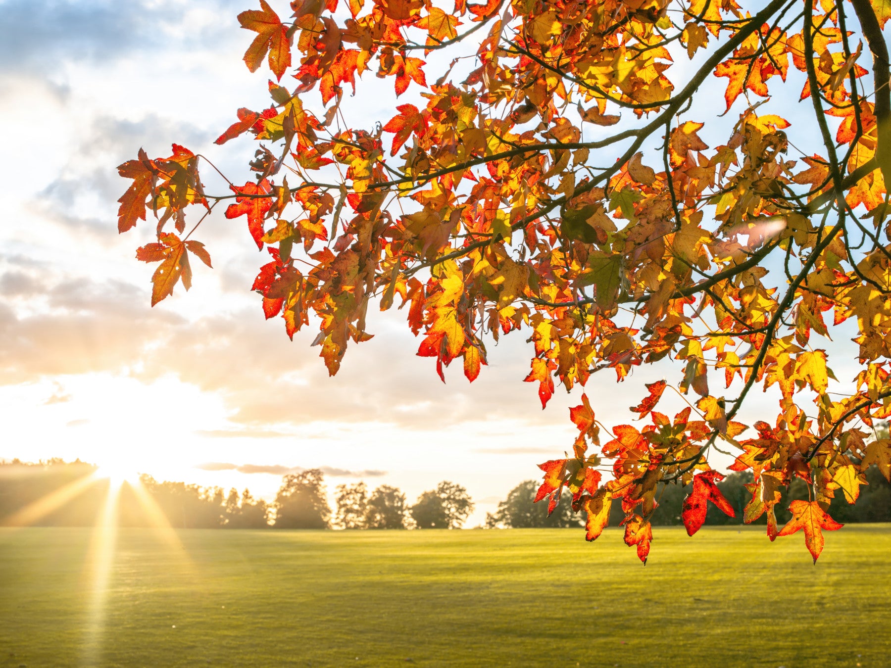 Solstråler og farvede blade i efteråret. Omfavn årstidens varme og skønhed med 'Efterårets Gyldne Symfoni'. Dette fængslende billede fremkalder den fredfyldte følelse af en sprød efterårseftermiddag, hvor naturen viser sine mest levende farver. En symfoni af gyldne, ravfarvede og karminrøde blade pryder en yndefuldt buet gren, oplyst af den bløde, strålende glød fra den nedgående sol. Sollyset bader en rolig eng i et varmt, æterisk lys og skaber en fredelig og indbydende atmosfære. Forvandl ethvert rum til et fristed af efterårscharme med dette fantastiske billede, perfekt til at tilføje et strejf af naturlig elegance og fredfyldt skønhed til dit opholdsrum.
