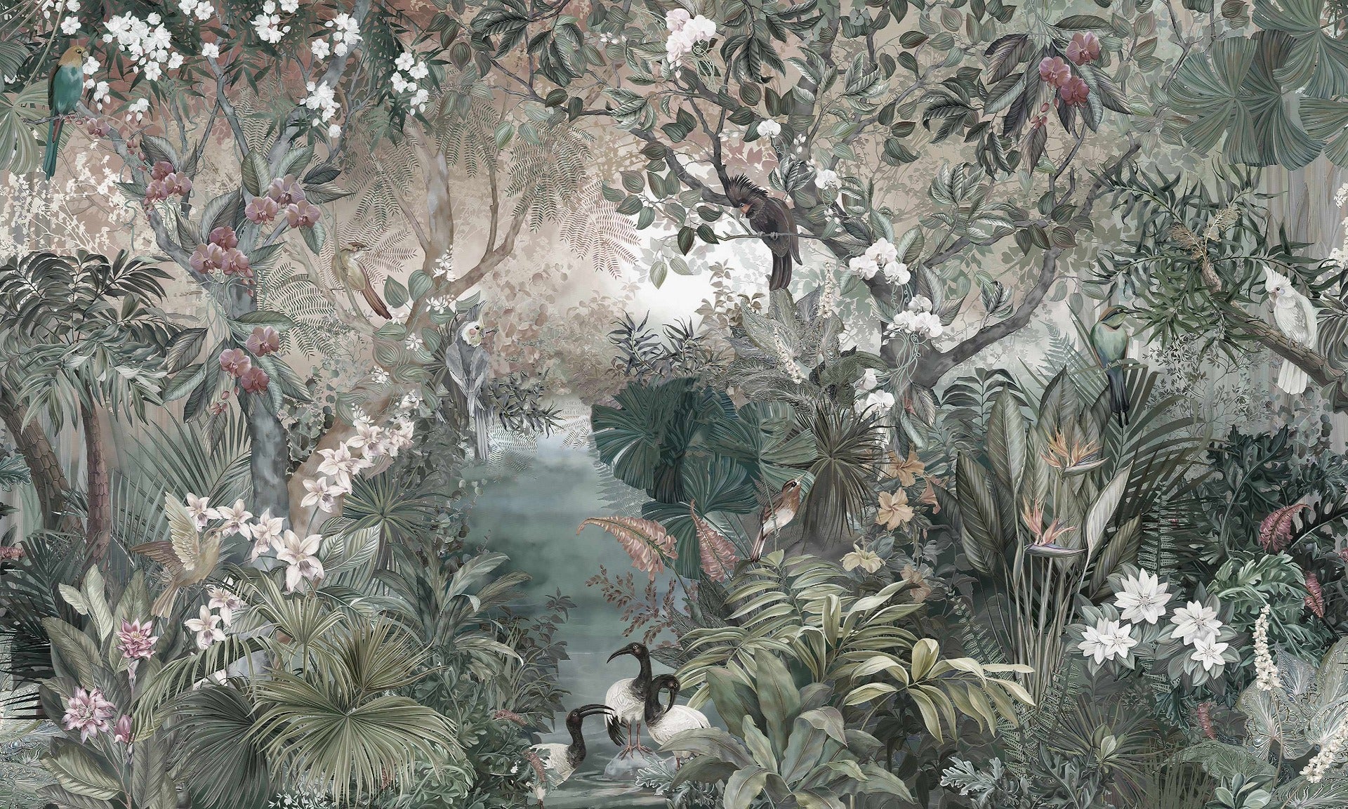 "Detailed Jungle Mural with Cranes and Tropical Plants"