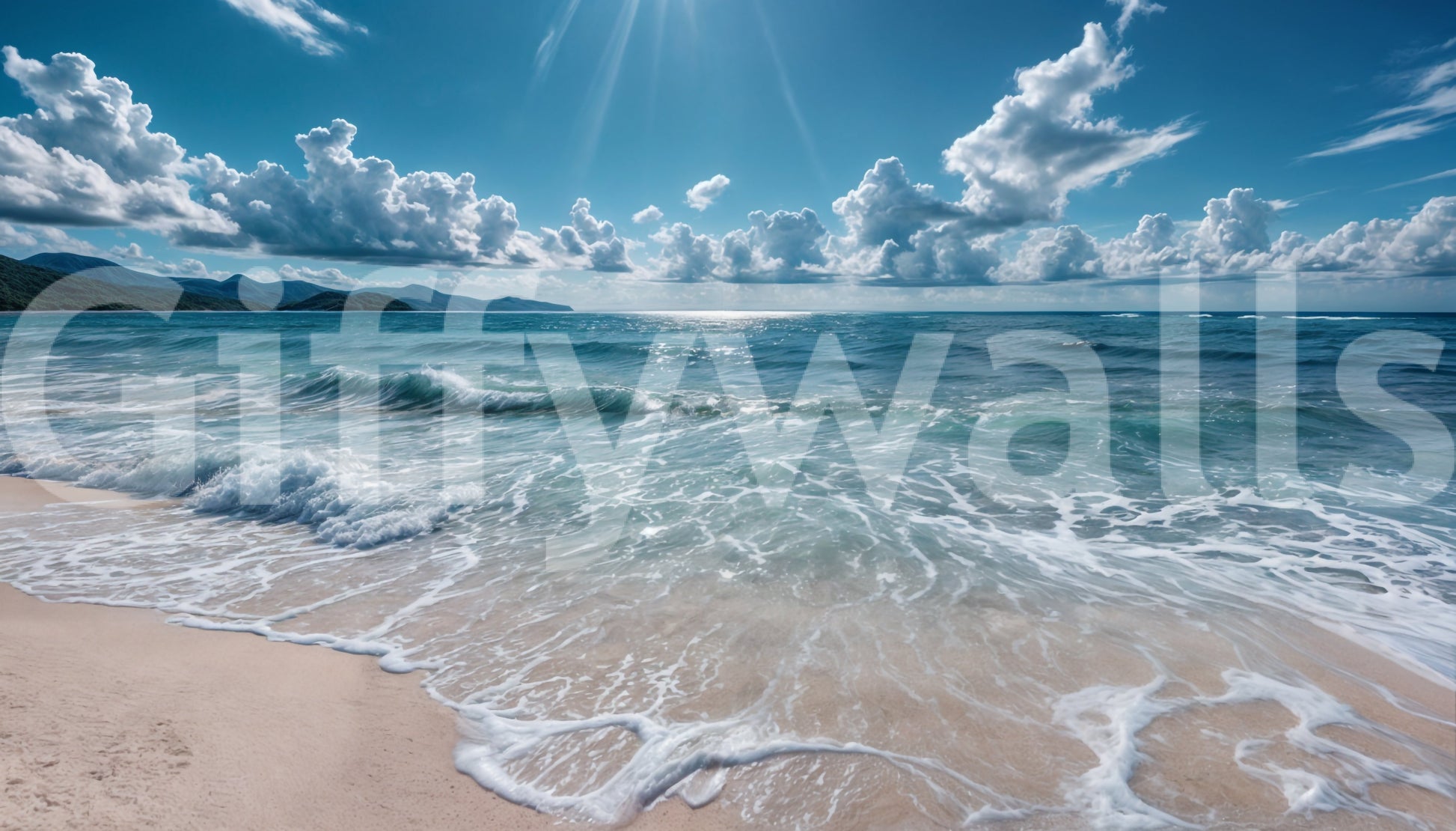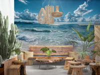 Bring the beauty of the ocean indoors with this inspiring wallpaper for walls. This design showcases a sun-kissed coastline with foamy waves meeting soft sand, all under a vast azure sky filled with fluffy white clouds. The cool color scheme emphasizes blues and whites, creating a fresh, airy feel in your home. Ideal for bathrooms, bedrooms, or sunrooms, this wallpaper enhances spaces with its peaceful vibe, complementing light wood furniture and nautical-themed accessories. It immediately evokes a sense of freedom, and transforms any room into an oasis of calm.