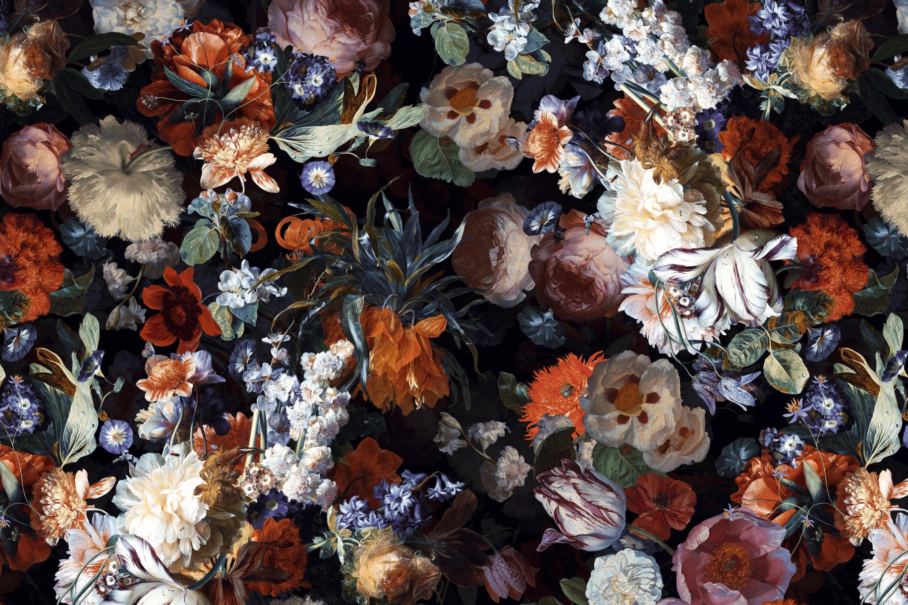 Step into a world of nocturnal enchantment with Baroque Moody Midnight Flower Garden. This wallpaper by Uta Naumann evokes the drama and opulence of the Baroque era, reimagined in a secret midnight garden. Sumptuous blooms of rose, peony, and tulip unfurl against a velvety black backdrop, their colors deepened and intensified by the moon's soft glow. Hints of copper and lavender dance amidst the lush foliage, creating an atmosphere of mystery and romance. The meticulously detailed floral arrangement pays homage to classical still-life paintings, lending a touch of timeless elegance to any space. Transform your walls into a dramatic statement piece with this moody and sophisticated design, perfect for creating a captivating and intimate ambiance.