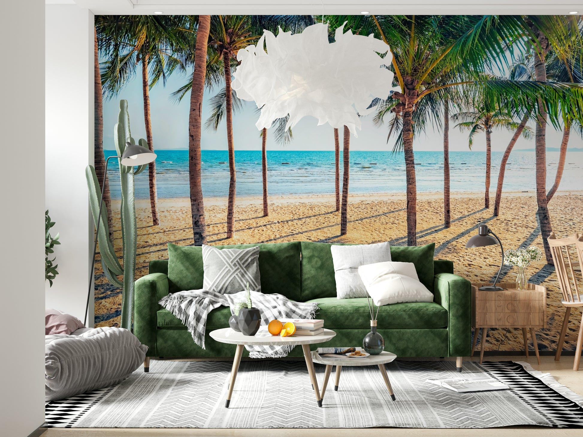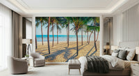 Escape to a sunny paradise with this beautiful beach wallpaper. Palm trees line the sandy shore, meeting the calm turquoise water. The warm sand and bright sky create a relaxing scene. This wallpaper for walls brings a sense of tranquility and summer vibes to any room. Its bright, open design complements living rooms, bedrooms, or even home offices, instantly turning them into a tropical retreat. Transform your space with this serene coastal view.