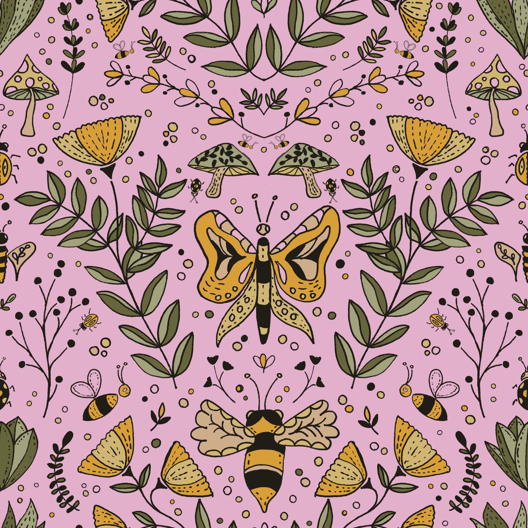Dette vægmaleri er et design med motiverne Bier, Sommerfugle og Blomster, et dejligt vægmaleri med en række finurlige insekter og planter på en blød lyserød baggrund. Det er et charmerende tapet til vægge i et børneværelse, et børneværelse eller et sjovt opholdsrum. Den håndtegnede stil og blandingen af legende detaljer giver dit rum en glad og sød følelse. Dette vægmaleri er lavet af holdbart materiale af høj kvalitet og er en enkel måde at opfriske din boligindretning med et muntert look.