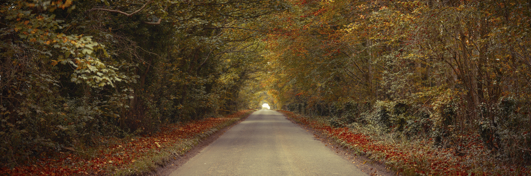 Features a scenic view of a straight road or path, disappearing into the distance.