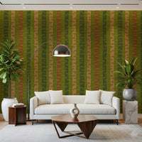 Abstract birch tree forest creates graphic stripes in retro warm earthy shades of gorgeous Green, Brown and Beige Earth Tones! Retro nature and woodlands! This pattern design is also available in Other Colourways too. Original wallpaper pattern design by Jackie Tahara of UnBlink Studio.