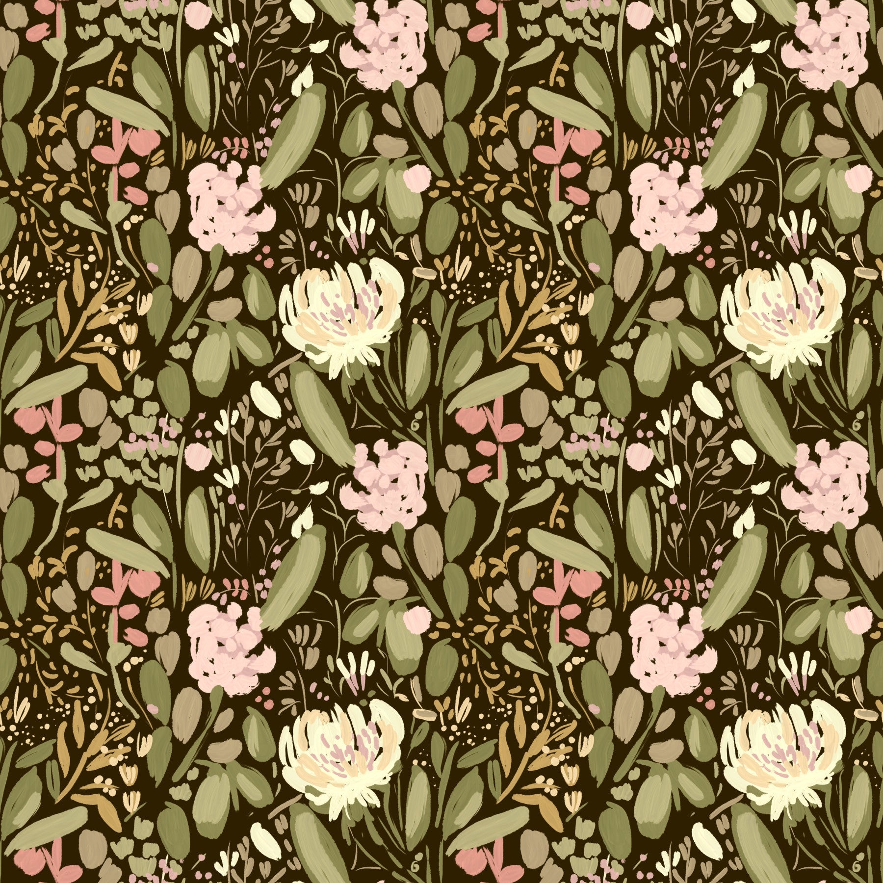 This seamless wallpaper features a striking floral pattern. The illustration has large flowers and stylized leaves with earthy tones against a dark backdrop. The design evokes a sense of rustic elegance. Consider this wallpaper for walls in a living room, bedroom, or dining room. Its botanical style complements interiors and creates a connection to nature.