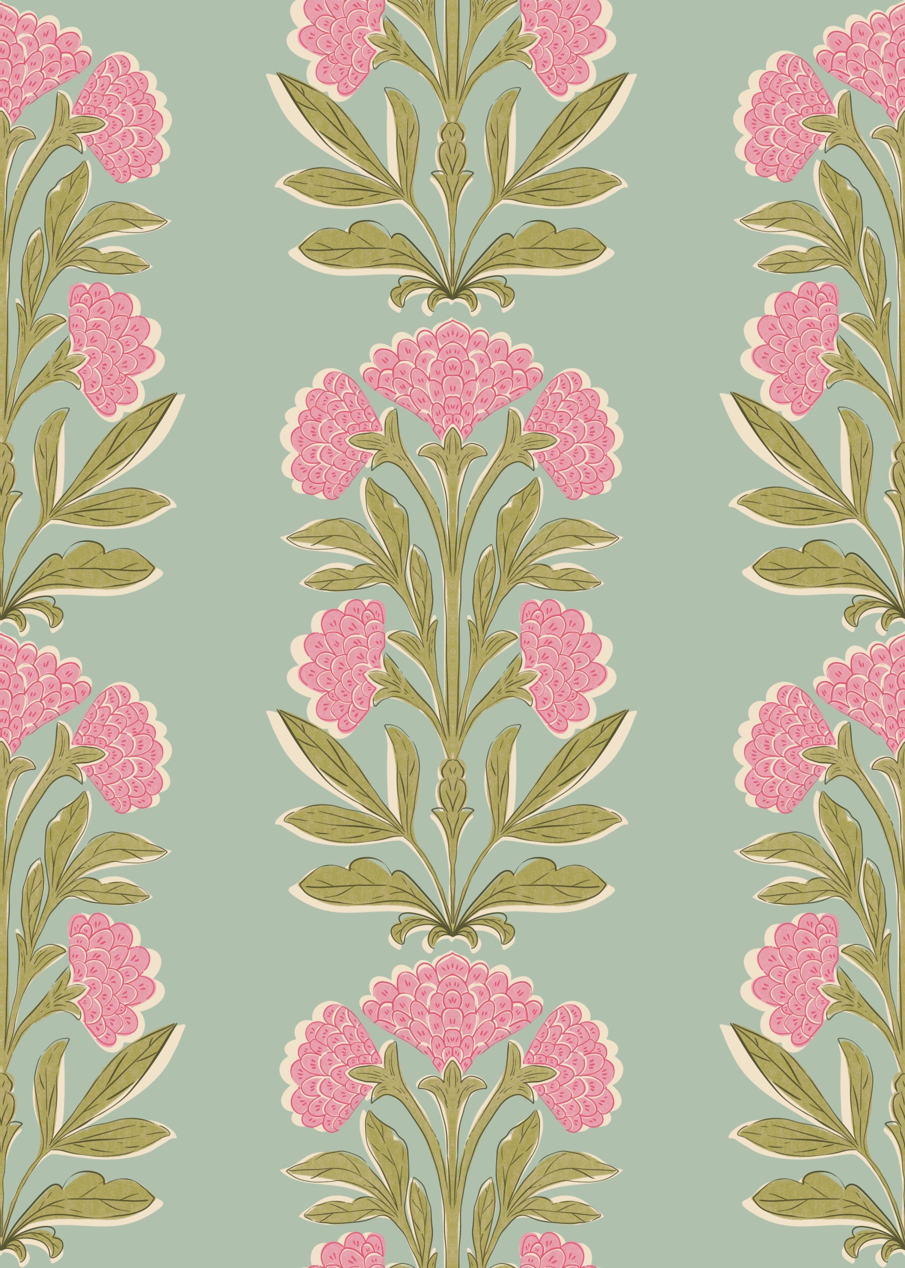 Løft dit rum med dette dejlige blomstermønster, et fængslende tapet til vægge. Dette design har et afbalanceret arrangement af lyserøde stiliserede blomster og grønne blade mod et blødt blå baggrund. Det klassiske botaniske motiv tilføjer et strejf af sindsro. Det fungerer smukt i stuer, soveværelser eller spisepladser. De dæmpede farver skaber en beroligende atmosfære, ideel til at skabe en rolig helligdom. Dette tapetdesign supplerer forskellige interiører, fra moderne til traditionel, der tilbyder et raffineret og stilfuldt touch.