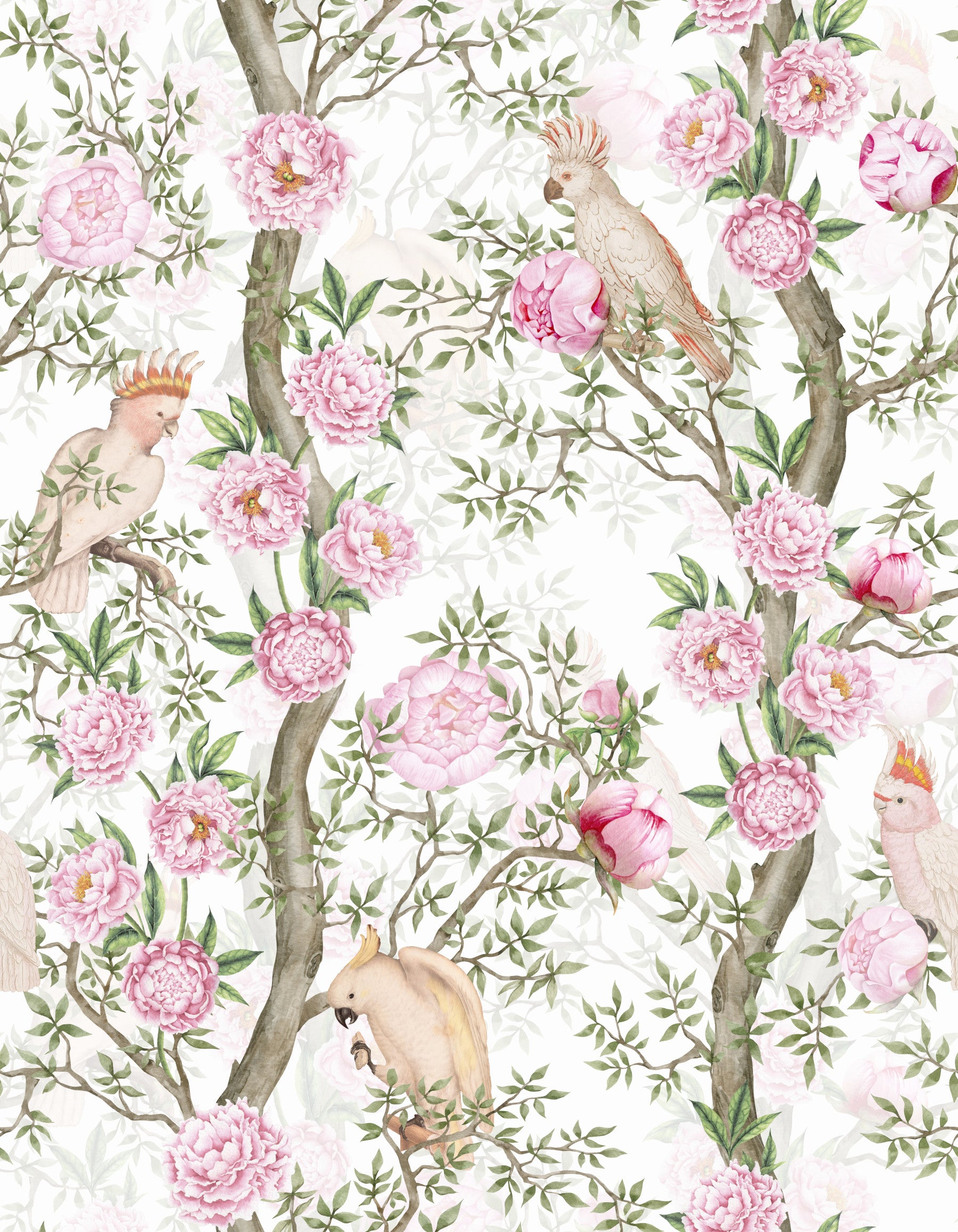 Fordyb dig i en verden af ​​delikat skønhed med dette tapet. Vandfarvemalede lyserøde pioner kaskade på tværs af designet, hvor deres bløde kronblade skaber en romantisk og æterisk atmosfære. Behagelige cockatoos gengives delikat midt i blomsterne og tilføjer et strejf af eksotisk charme. Det sømløse mønster giver en følelse af kontinuitet, ideel til større rum såsom stuer eller gange. De bløde, dæmpede toner af lyserød og grøn skaber en beroligende og sofistikeret æstetisk.