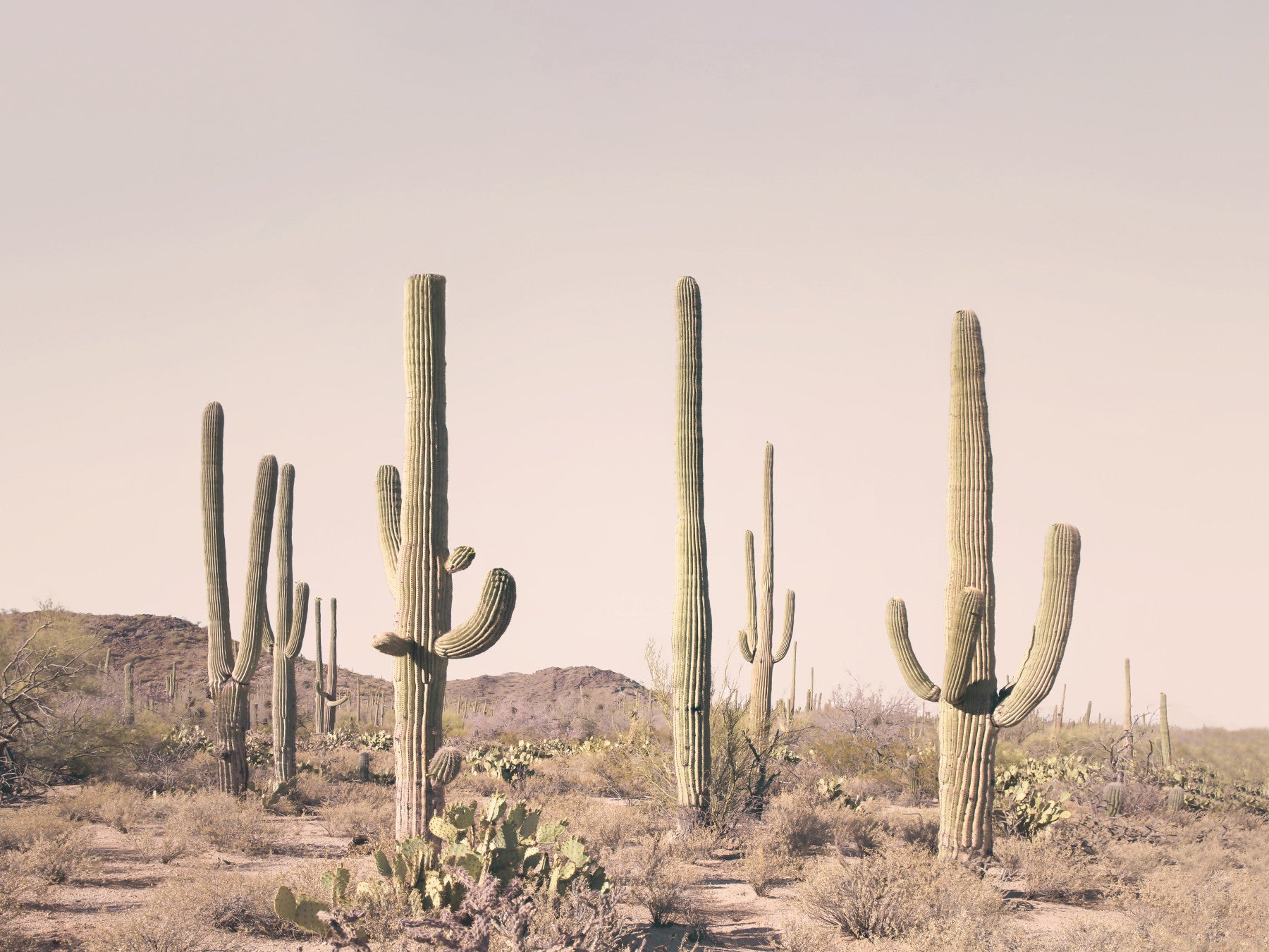 Badet i et blødt, rødmet tonet lys viser dette tapet en betagende vidde af Saguaro-kaktus. Tårnhøjde sentineller af ørkenen, disse majestætiske planter står silhuetterede mod en bleg himmel, hvor deres strukturerede former skaber et visuelt slående landskab. Mindre kaktus- og ørkenbuske prikker forgrunden og tilføjer dybde og tekstur til scenen. Den samlede stemning er rolig og rolig, der fremkalder en følelse af fred og den rå skønhed i ørkenens vildmark. Denne minimalistiske ørken -scene tilbyder en sofistikeret og beroligende æstetisk, perfekt til dem, der søger et strejf af sydvestlige sindsro i deres digitale rum.