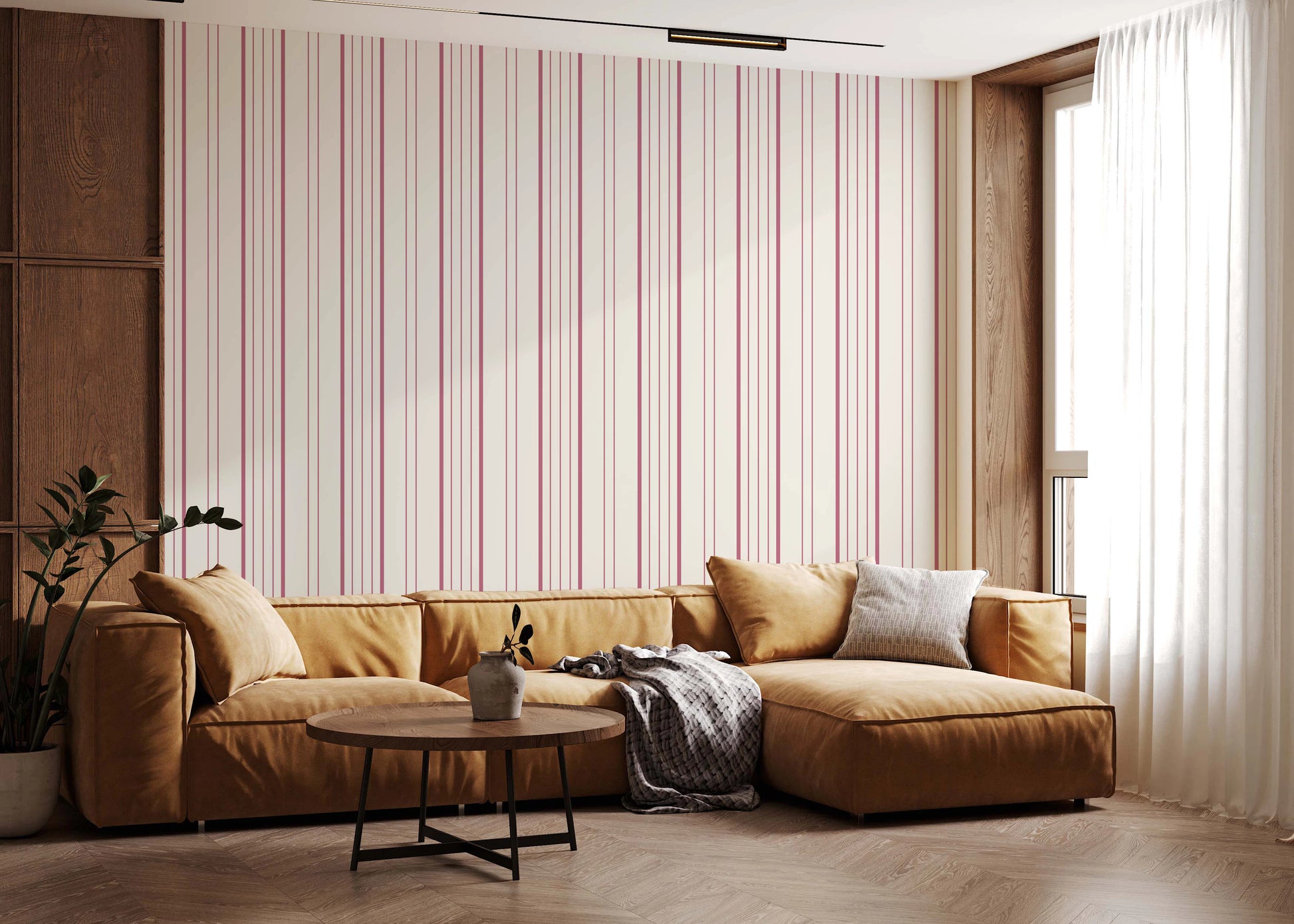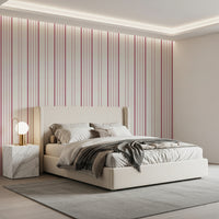 Bring et strejf af underspillet sofistikering til ethvert rum med dette raffinerede vægtapet. Delikate lodrette striber i lyserød danser hen over et roligt, off-white lærred. Dette design tilbyder en ren, moderne fornemmelse, samtidig med at det fremkalder en følelse af ro og orden. Det lysner og blødgør rum, hvilket gør det ideelt til soveværelser, badeværelser eller stuer. Den enkle, men visuelt tiltalende æstetik gør det ideelt til en række forskellige indretningsstile, fra moderne til minimalistisk til skandinavisk. Det bringer en tidløs elegance og et strejf af feminin varme til enhver væg, det pryder.