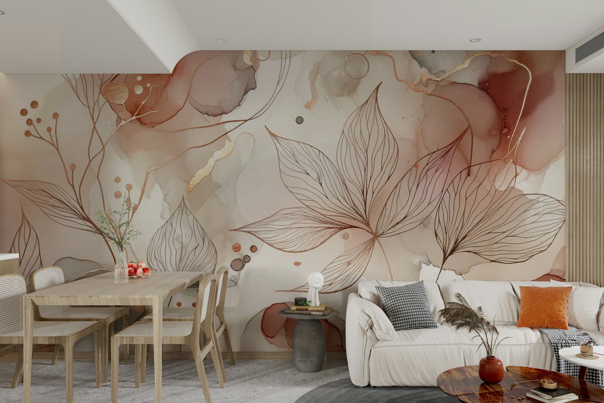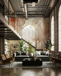 Dette tapet har en betagende blanding af abstrakt akvarelvask i jordagtige toner af rødme lyserød, terracotta og blød beige, overlagt med delikat, håndtegnet botanisk linjekunst. De organiske former for akvarel skaber en følelse af fluiditet og bevægelse, mens de nøjagtige linjer i botanikerne tilbyder et kontrapunkt for struktur og elegance. Guld accenter tilføjer et strejf af luksus og sofistikering, hvilket gør dette tapet til et perfekt valg til at skabe en beroligende og stilfuld atmosfære i ethvert rum. Den dæmpede farvepalet fremmer afslapning og ro, hvilket gør den ideel til soveværelser, stuer eller endda meditationsrum. Designet er både sofistikeret og tilgængelig og tilbyder en subtil, men alligevel virkningsfuld visuel udsagn.