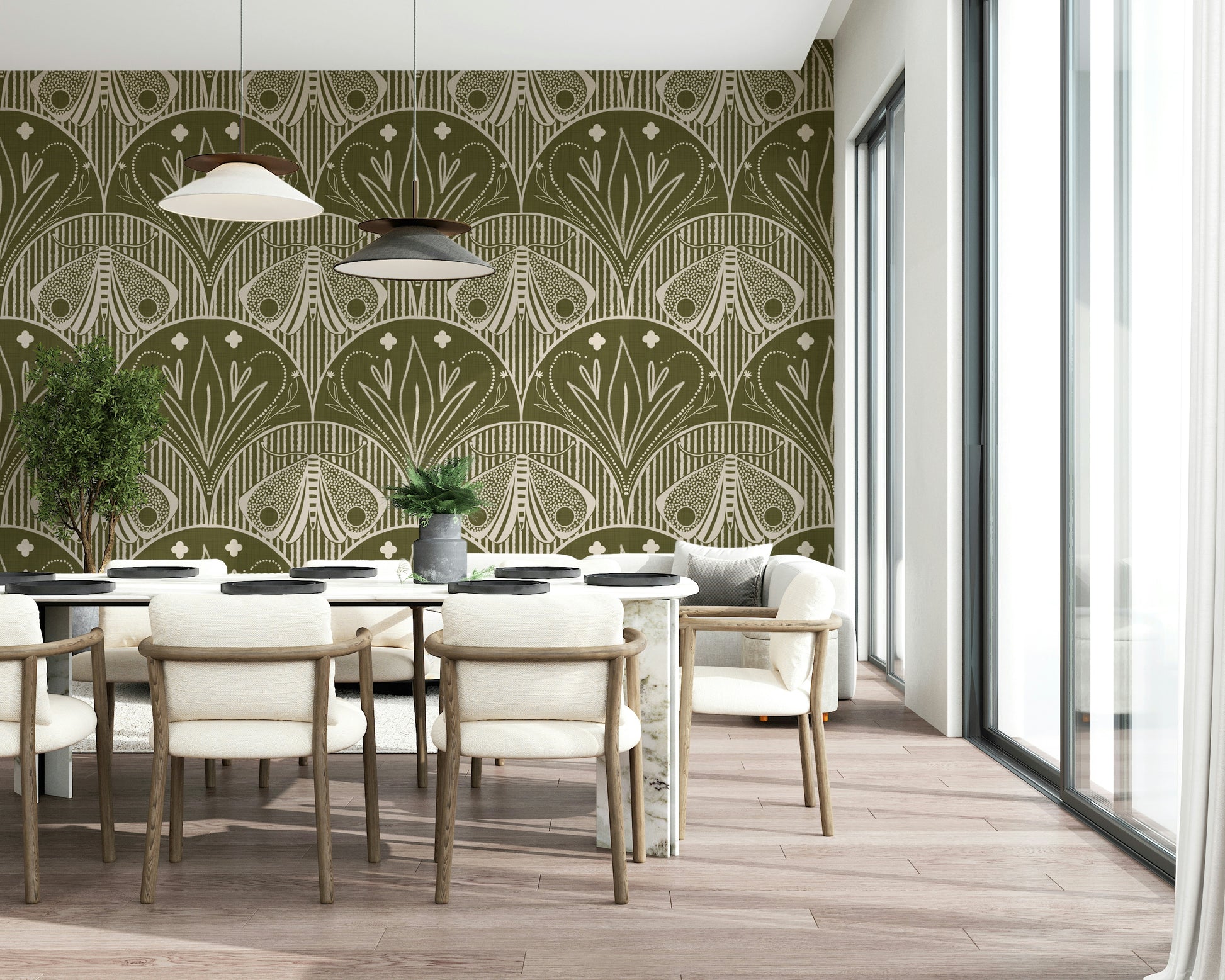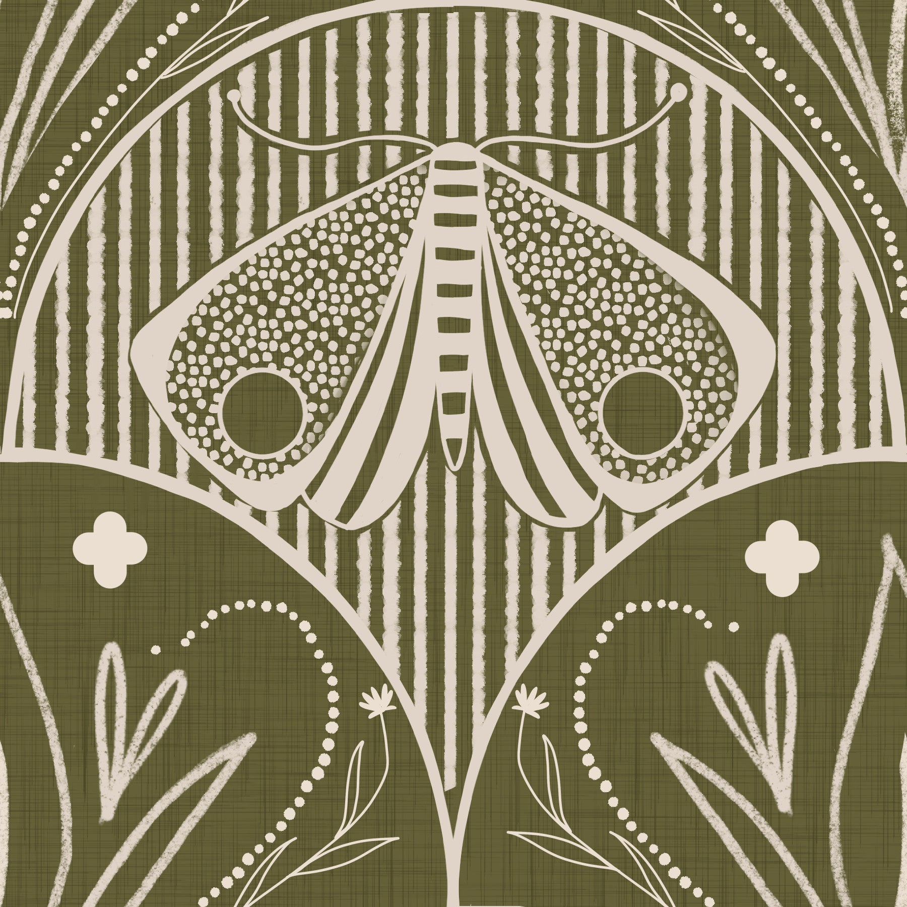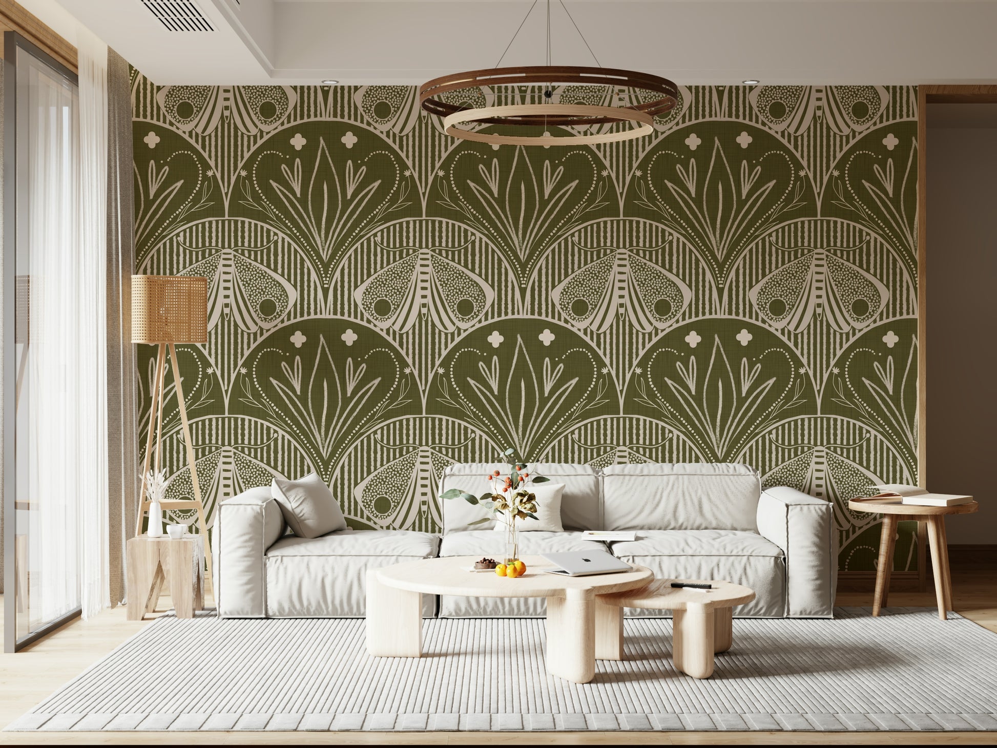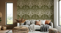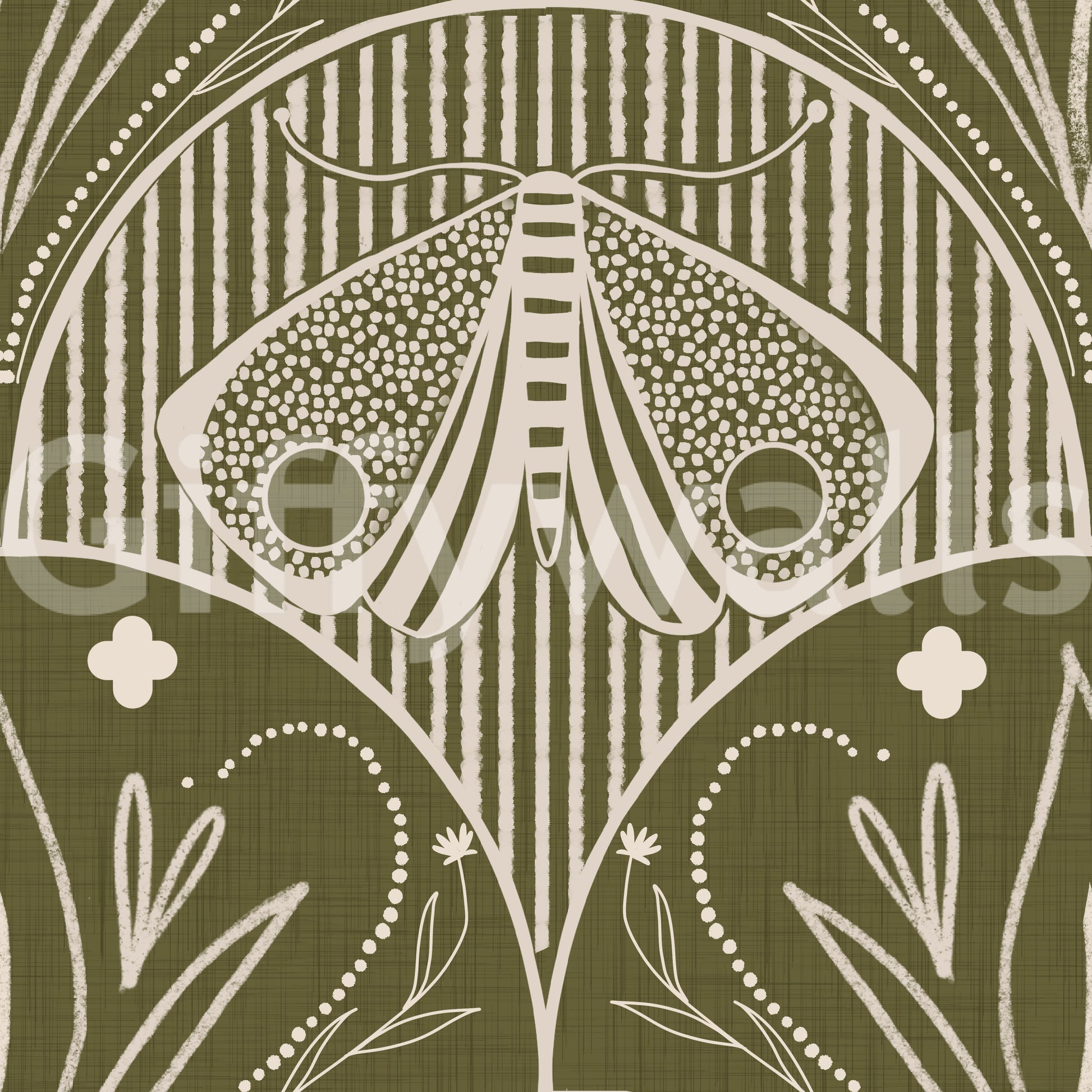 Boho Art Nouveau Scallop Butterfly Floral in Olive Drab Wallpaper⁠