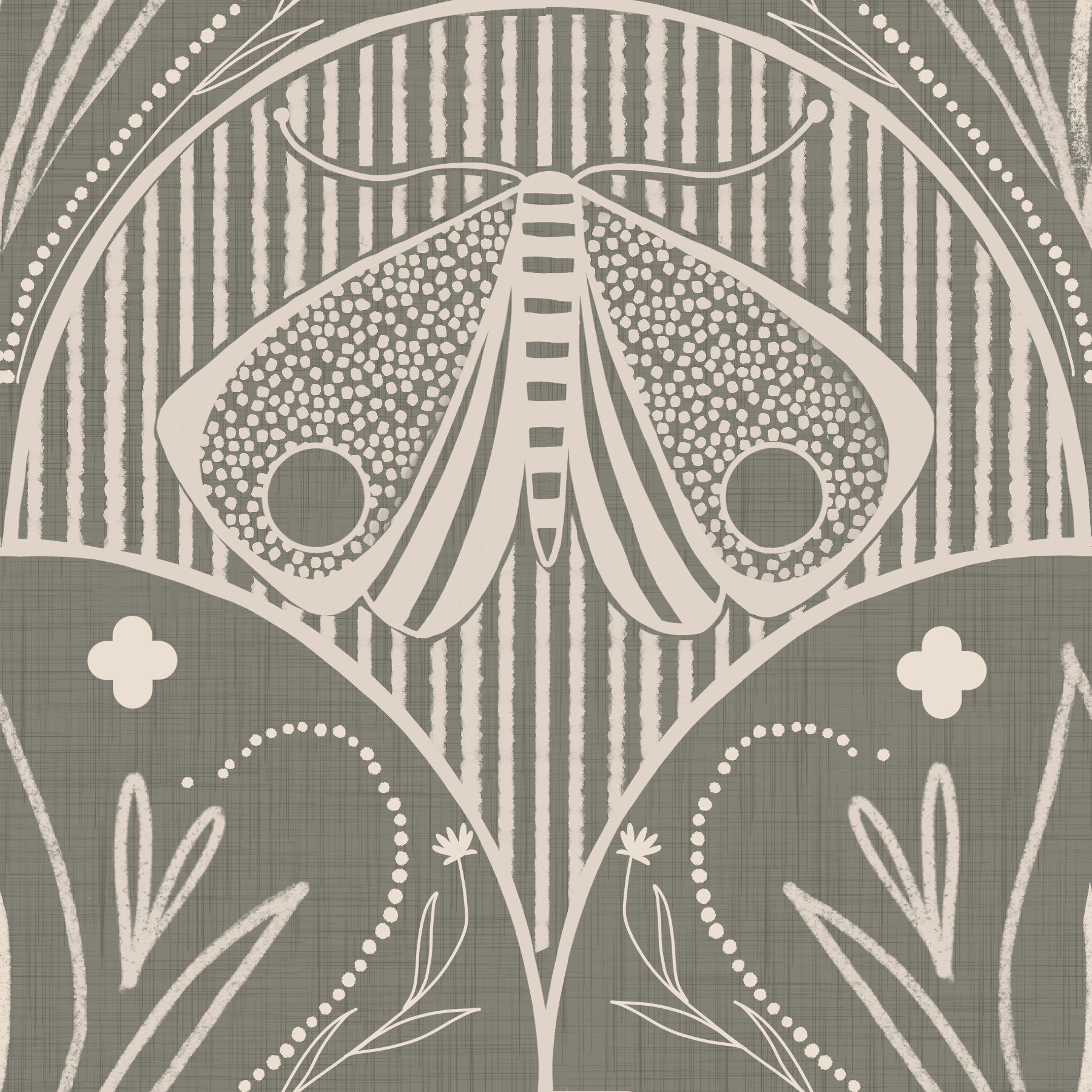 Embrace the serene beauty of our "Boho Art Nouveau Scallop Butterfly Floral" wallpaper. This design masterfully blends bohemian freedom with the structured elegance of Art Nouveau, rendered in a palette of warm taupe and gentle grey. A stylized moth/butterfly, the central motif, anchors the design with its intricate details and symmetrical composition. Scalloped arches and delicate floral accents, interspersed with dotted lines, surround the butterfly, evoking a sense of vintage charm and organic growth. The subtle, textured background adds depth and dimension, lending a tactile quality to this sophisticated pattern. Ideal for creating a calming and stylish ambiance in any room, this wallpaper brings a touch of nature-inspired artistry to your walls, perfectly capturing the essence of both the free-spirited boho aesthetic and the refined Art Nouveau movement. Transform your space into a haven of tranquility with this unique and captivating design.