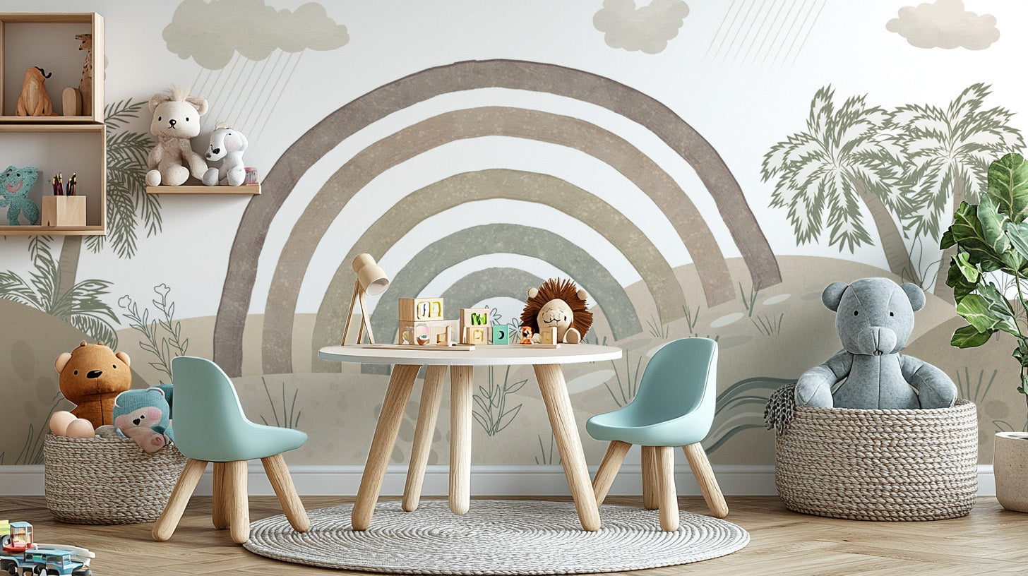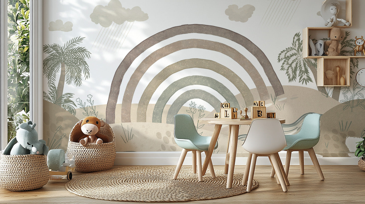 Scandinavian pastel wallpaper featuring a rainbow scene