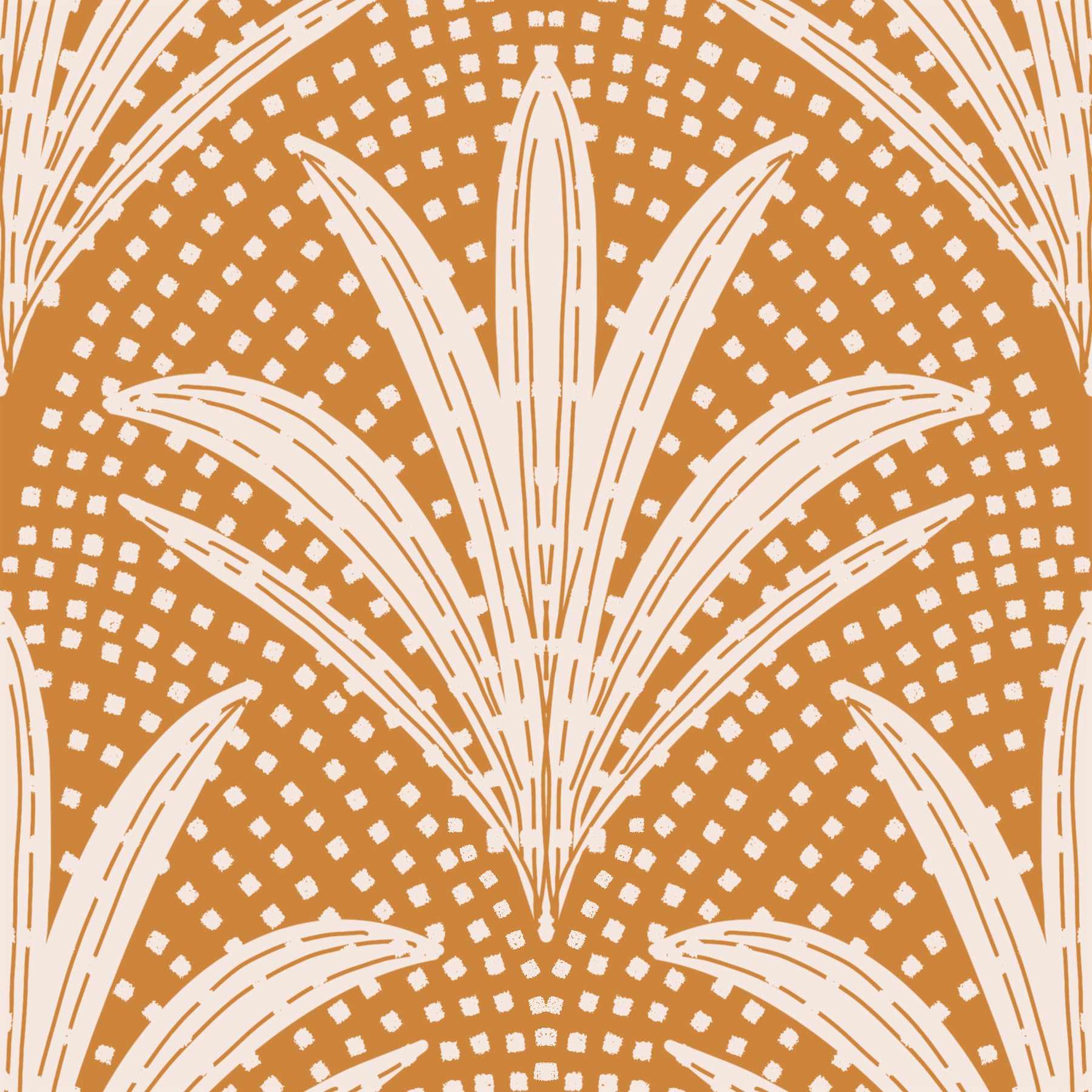 Omfavne de varme, jordagtige toner af denne Boho rustikke palme udstrålende karamelbrunt tapet. Stiliserede palmefronds i blød off-white stråler yndefuldt udad mod en rig karamelbrun baggrund, punkteret af et subtilt struktureret prikmønster. Designet fremkalder en følelse af afslappet sofistikering, blanding af bohemsk æstetik med rustik charme. Perfekt til at skabe en rolig og indbydende atmosfære i ethvert rum, dette tapet tilbyder en unik og visuelt tiltalende blanding af organiske former og geometriske detaljer, hvilket gør det til et ideelt valg for dem, der søger et strejf af moderne varme i deres boligindretning.