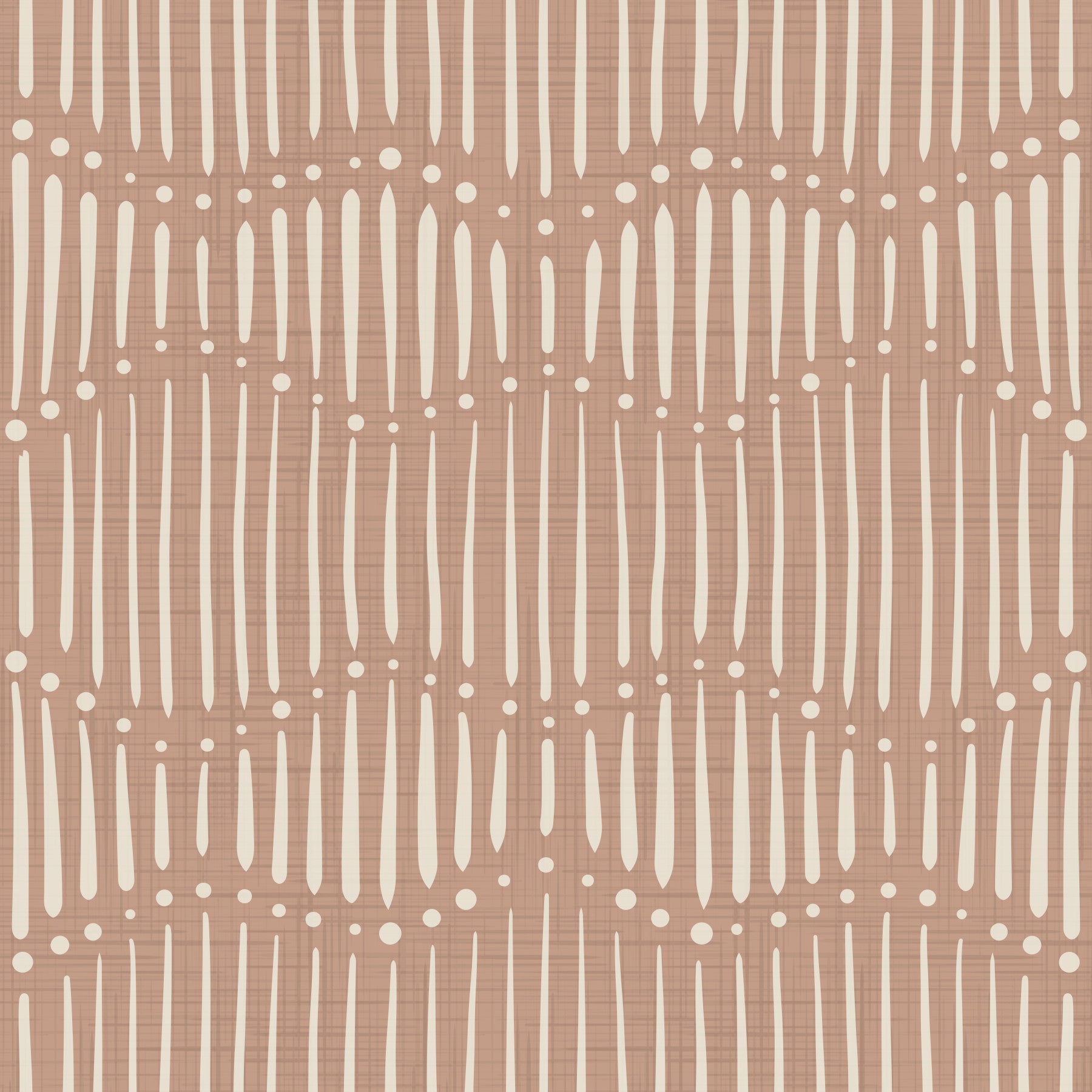 Embrace the free spirit of 'Boho Waves On Sirocco Canvas,' a wallpaper that brings a touch of earthiness and artistic flair to your space. The sirocco-inspired backdrop, a warm and inviting terracotta hue reminiscent of desert landscapes, provides a textured canvas for the whimsical interplay of ivory-toned, stylized waves. These aren't your typical ocean waves; they're more like subtle rhythmic pulses, softened with a bohemian touch. Scattered circular accents punctuate the design, adding depth and a playful energy. The overall effect is one of understated elegance and relaxed comfort, making it the perfect choice for creating a calming and stylish atmosphere. Ideal for living rooms, bedrooms, or any space where you seek a touch of artistic warmth and relaxed vibes.