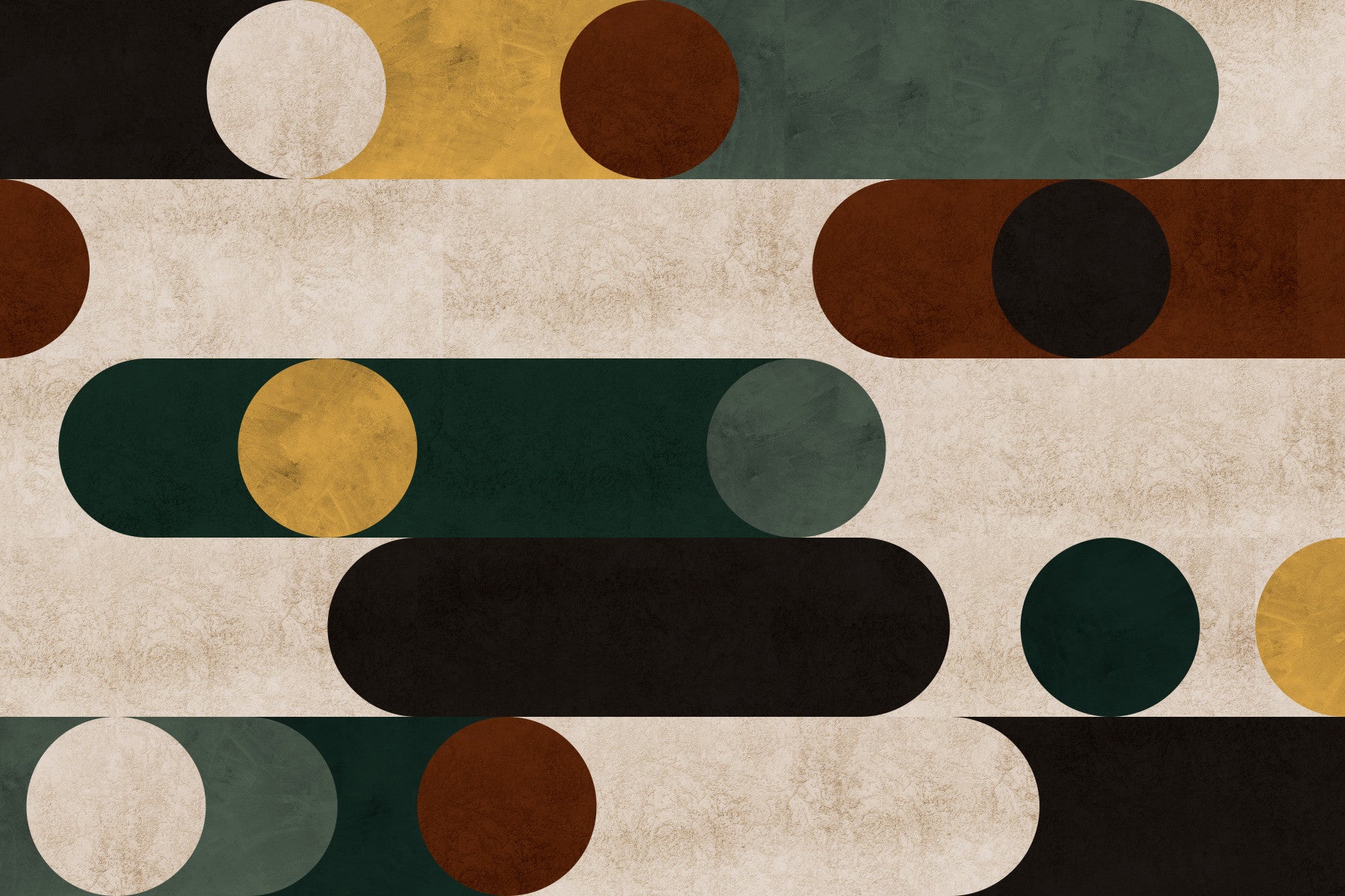 Dette abstrakte tapetdesign viser kraften i dristige geometriske former. Et fængslende samspil mellem cirkler og langstrakte, afrundede rektangler skaber et visuelt slående mønster. Rige jordfarver - dybe greener, varme brune og et dæmpet guld - er lagdelt mod en neutral beige baggrund, der giver en sofistikeret og beroligende stemning. Det strukturerede udseende tilføjer dybde og intriger, der omdanner enkle former til et sofistikeret og moderne udsagnsstykke. Perfekt til at tilføje et strejf af minimalistisk elegance til enhver digital enhed.