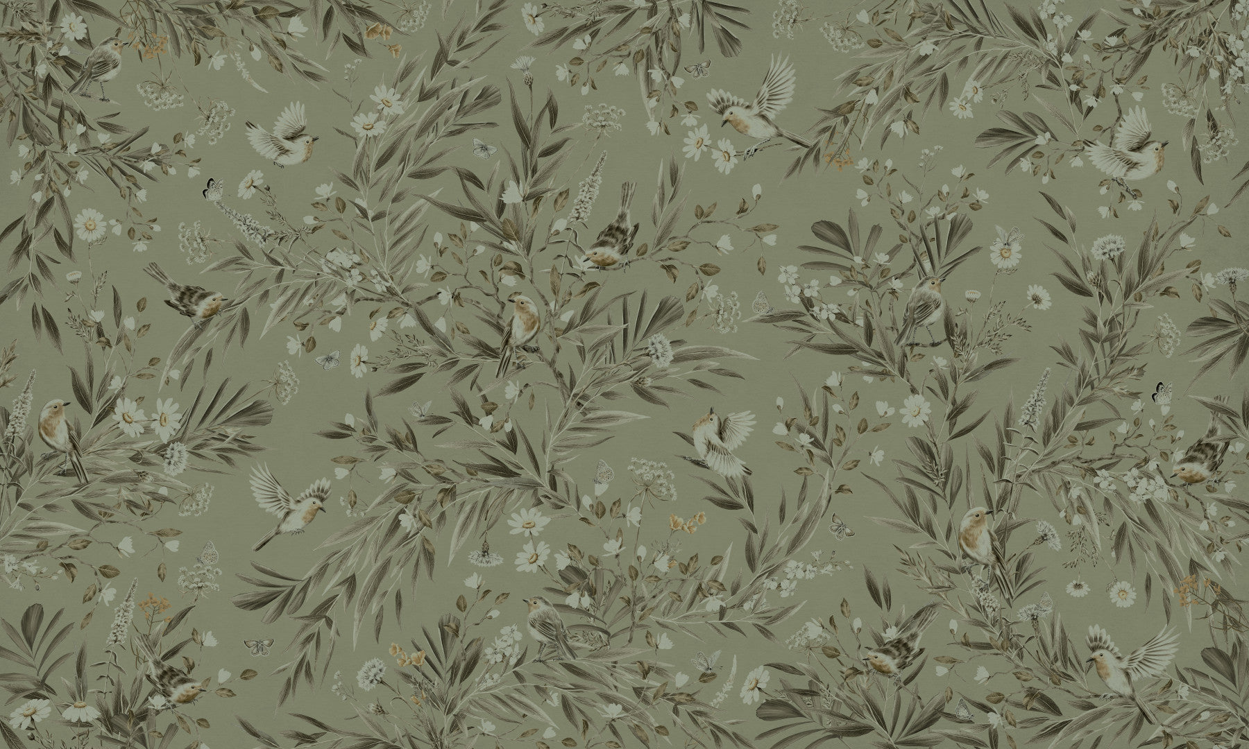 Romantic wall mural depicting birds and plants in a harmonious natural scene