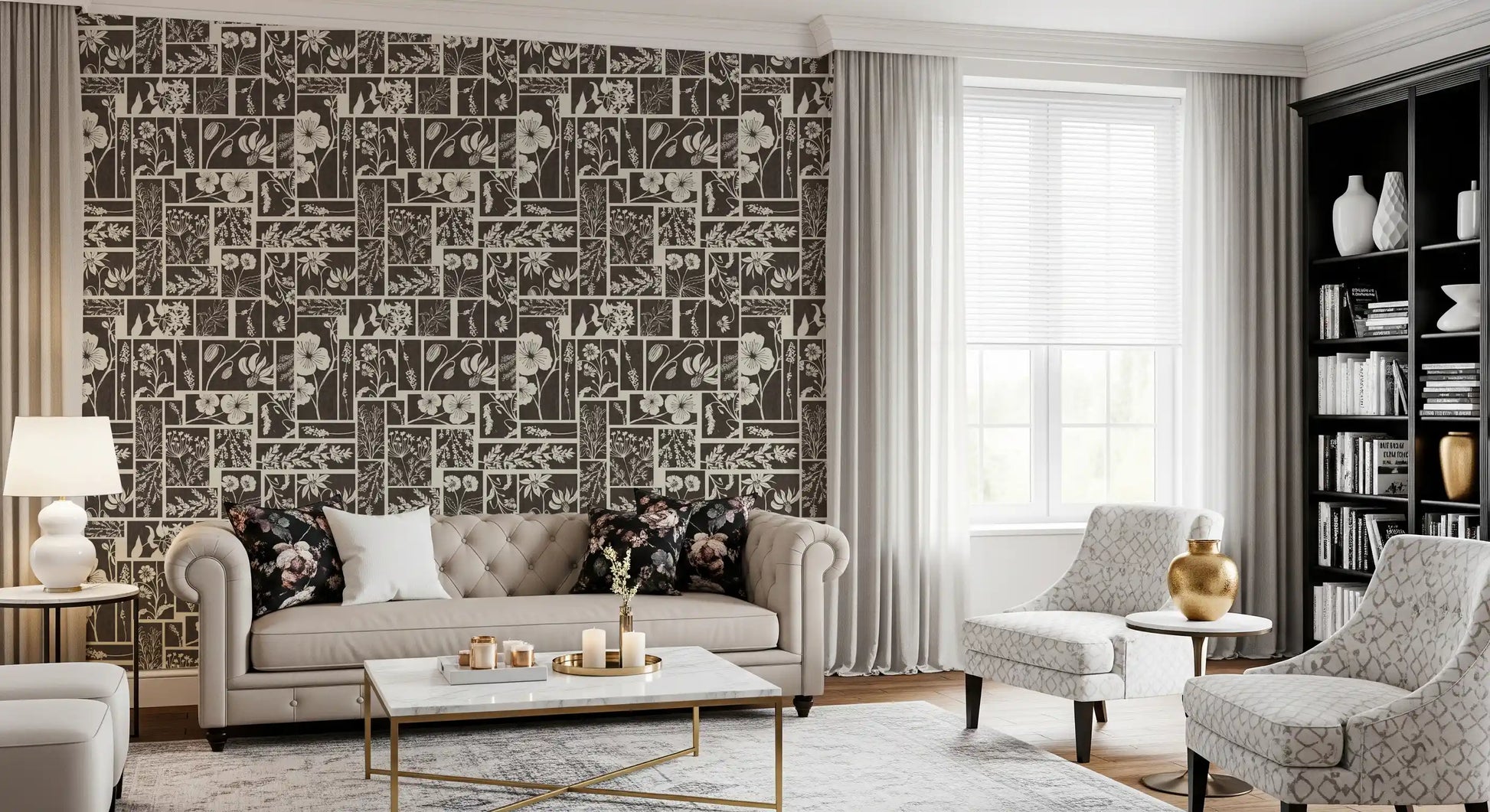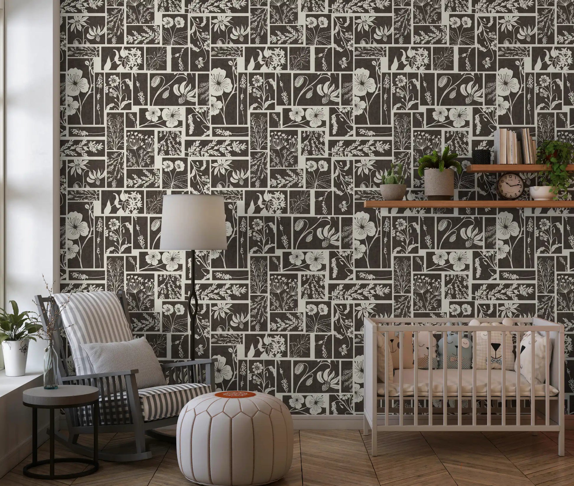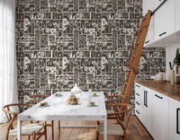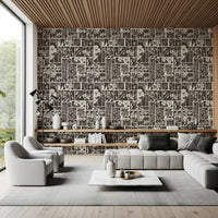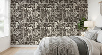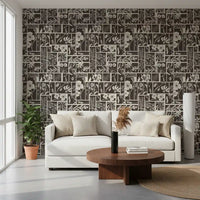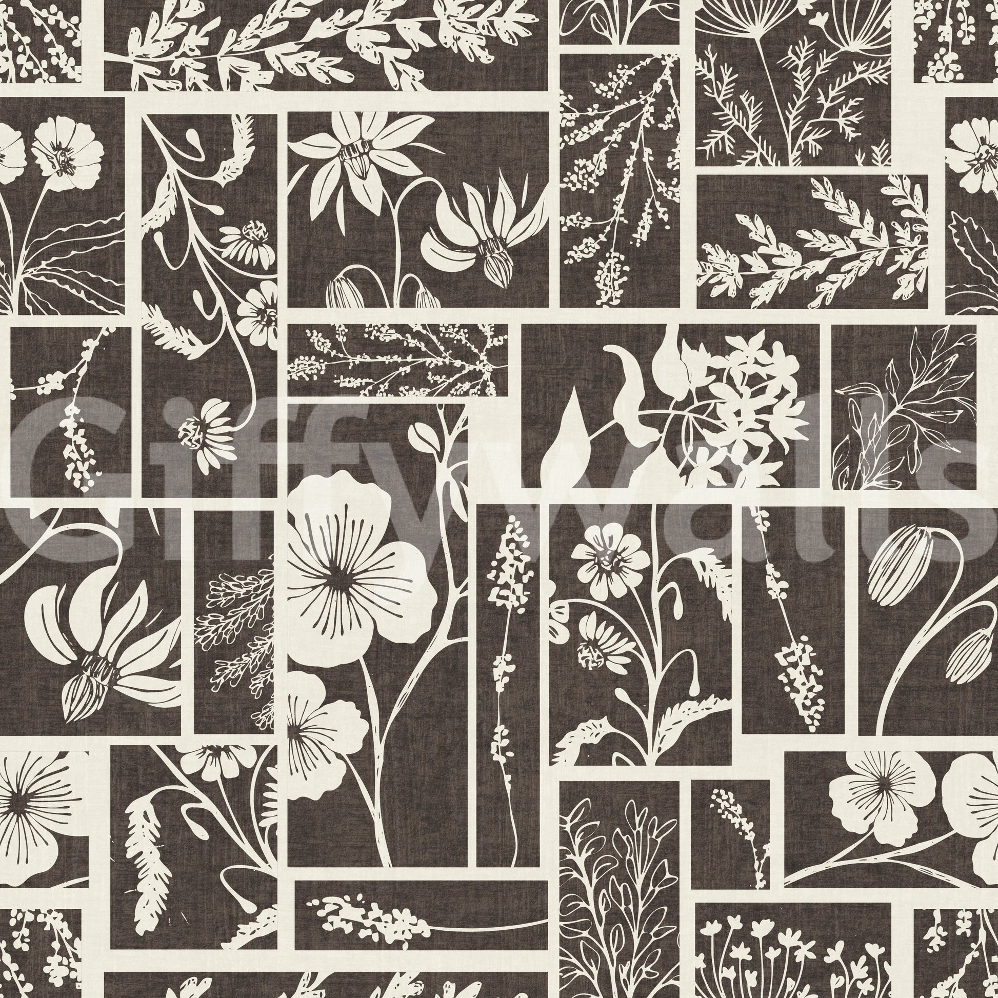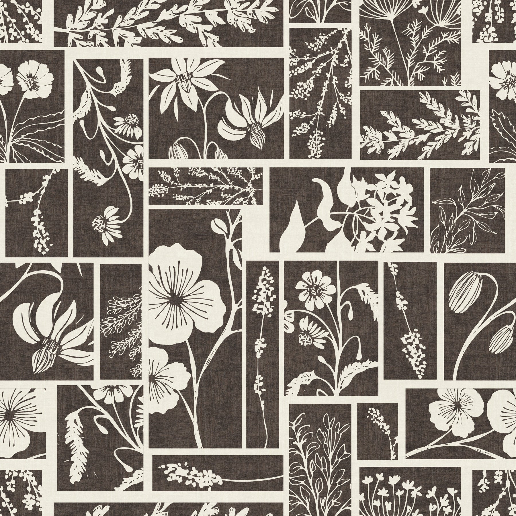 Dette unikke vægtapet har et fængslende botanisk bloktrykdesign. Det præsenterer et gennemtænkt arrangement af forskellige blomster- og bladmotiver, der hver især er omgivet af distinkte rektangulære og firkantede paneler. Den monokrome palet af dyb trækul og blød creme skaber en tidløs appel, der tilbyder både kontrast og harmoni. Dette design tilføjer en organisk, rustik elegance til ethvert interiør. Hæng det i en stue for at skabe en rolig atmosfære, eller brug det i et soveværelse for et behageligt, naturligt præg. Det giver også en sofistikeret karakter til spisestuer eller et hjemmekontor og komplementerer både moderne og traditionelle møbler med sin jordnære charme og kunstneriske flair.