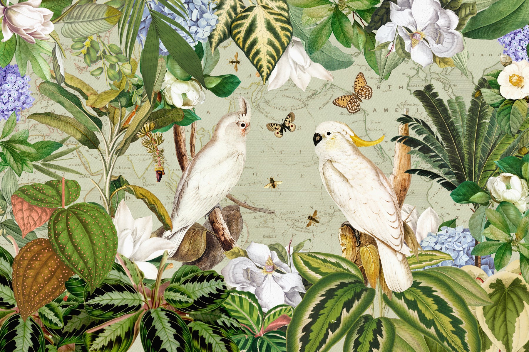 Dette tapet er en fængslende blanding af botanisk kunst og kartografisk intrige. To majestætiske hvide cockatoos, der er gengivet i udsøgte detaljer, er beliggende blandt en overflod af tropisk flora og delikate sommerfugle. Baggrunden har et falmet verdenskort, der antyder fjerne lande og eventyrlystne ekspeditioner. Den subtile farvepalet, domineret af bløde greener, cremer og hvide, skaber en rolig, men alligevel eksotisk atmosfære, perfekt til at tilføje et strejf af raffineret elegance til ethvert rum. Tapetets blanding af vintage charme og naturlig skønhed gør det til et ideelt valg for dem, der værdsætter både historie og natur.