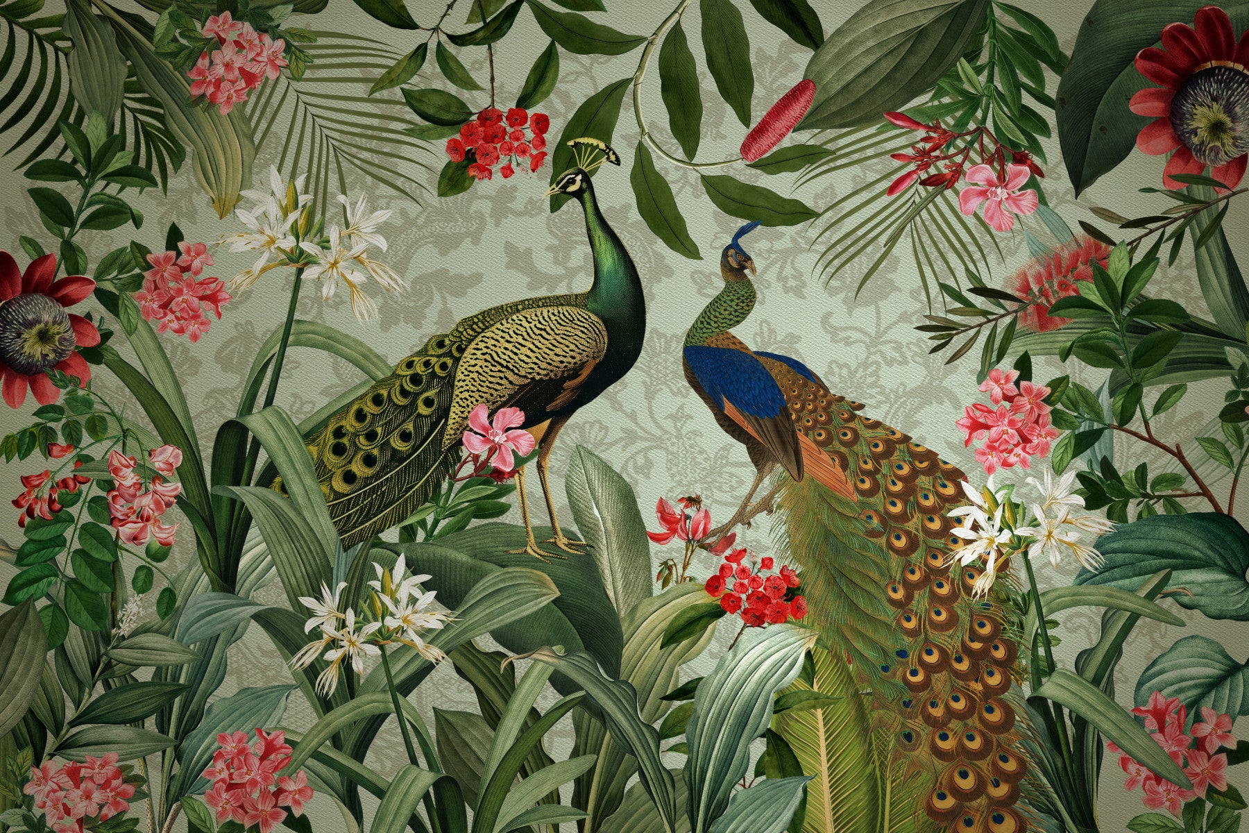 Dette tapet er et storslået botanisk vægmaleri, der viser to påfugl i en frodig, tropisk omgivelse. Kunstnerens dygtighed til at fange de komplicerede detaljer om både fuglenes fjerdragt og den omgivende flora er bemærkelsesværdig. Den samlede æstetik er en af ​​raffineret elegance med en farvepalet, der blander rige juveltoner med blødere, mere dæmpede nuancer af grøn. Tapetet skaber en følelse af dybde og dimension og omdanner et rum til en rolig og visuelt fantastisk helligdom. Dette stykke er perfekt til en erklæringsvæg i ethvert rum, der har brug for et strejf af sofistikeret karakter.